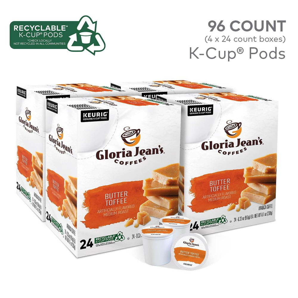 Cafés Gloria Jeans Butter Toffee, cápsulas Keurig K Cup de serviço único, café torrado médio com sabor, 96 Count Sabor Manteiga Toffee Tamanho 96 unidades Um café médio com sabor assado com notas suaves de caramelo amanteigado de caramelo.