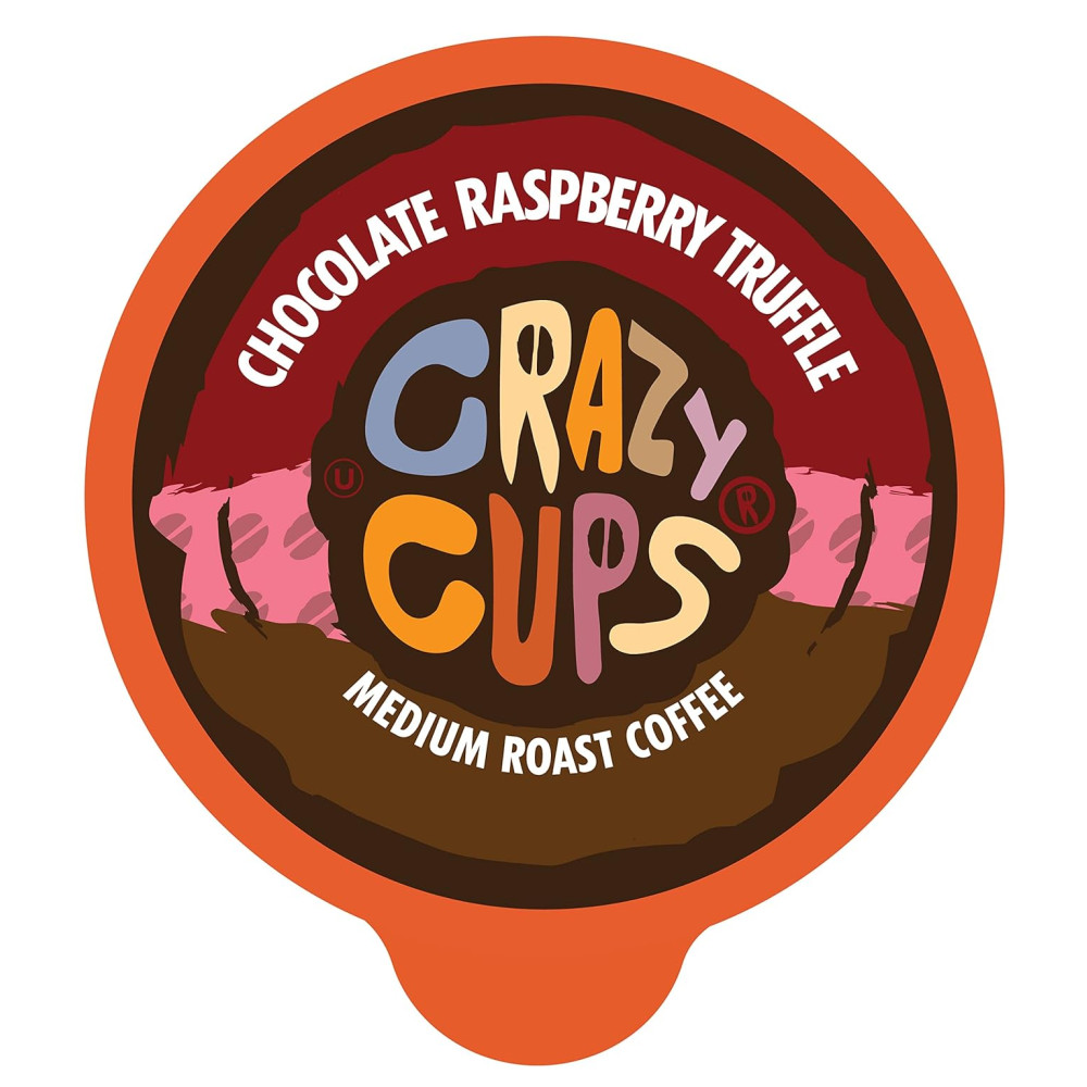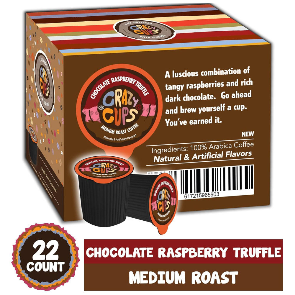 Crazy Cups sabor café para máquinas Keurig K Cup, trufa de framboesa com chocolate, bebidas quentes ou geladas, 22 doses individuais, cápsulas recicláveis Kosher Gluten Free Caffeinated Kcup Pod Coffee EXPERIMENTE MAIS SABOR COM COPOS LOUCOS Uma combinação deliciosa de framboesas picantes e chocolate preto rico.
