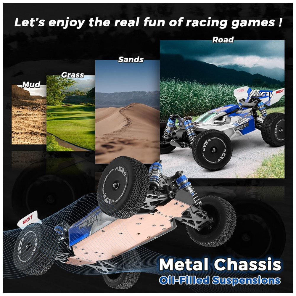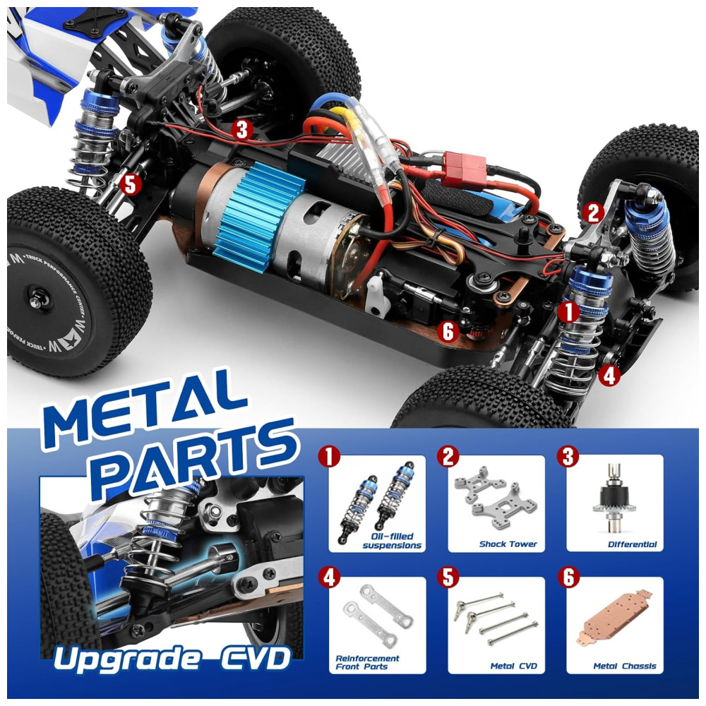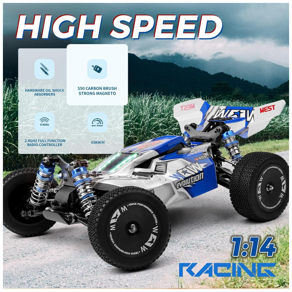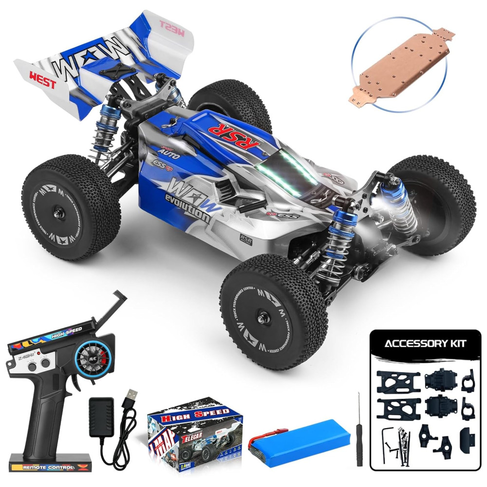Carrinho de Controle Remoto 4×4, Escala 1 14 com Luzes e Valocidade até 65 km h, CKYSCHN WLtoys 144011, Azul: Atualize seu carro de controle remoto com o WLtoys 144011, um buggy RC rápido equipado com um motor 17500RP 550 e um dissipador de calor de metal, permitindo velocidades máximas de até 65kmh.