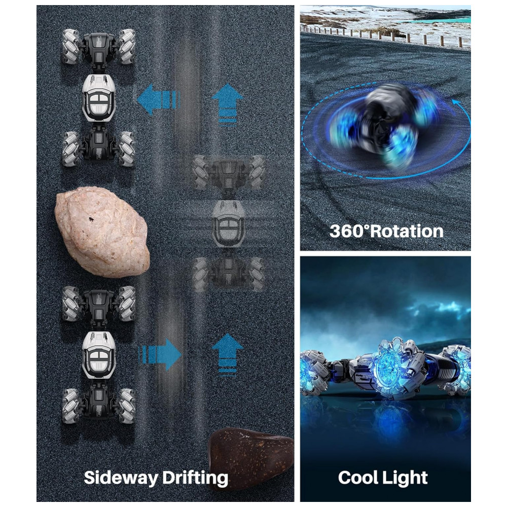 Carrinho de Controle Remoto e Sensor de Gestos com Rotação 360 e Luzes LED, DoDoeleph, Cinza: Este é um controle remoto recarregável por gestos manuais para um carrinho de brinquedo.