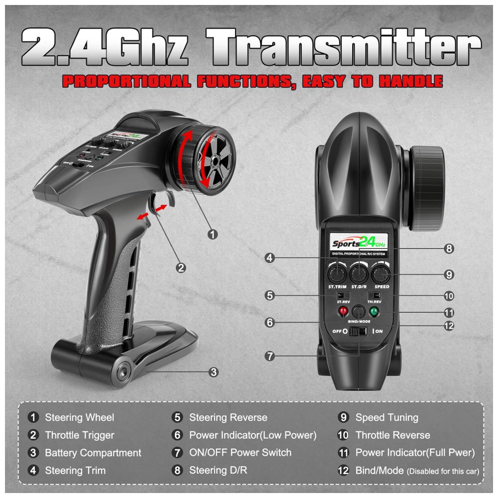 O sistema de controle de rádio de 2,4 GHz tem um alcance de controle de mais de 100,3 metros, permitindo competir com muitos carros de corrida sem interferência de sinal.