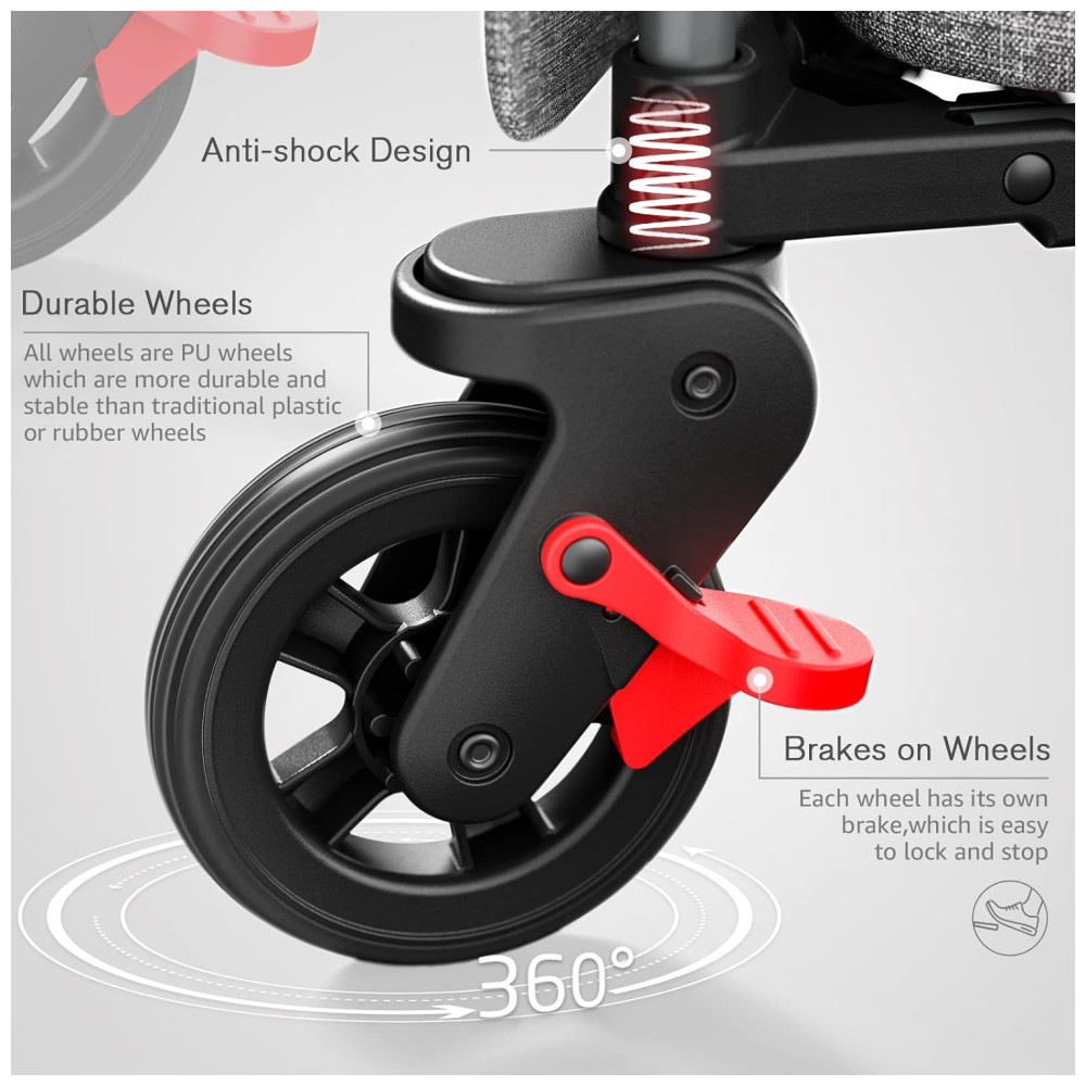 Equipado com freios de um passo em todas as rodas, o carrinho garante controle total da direção.