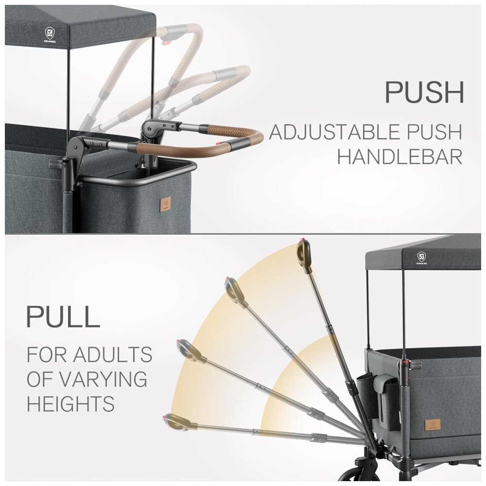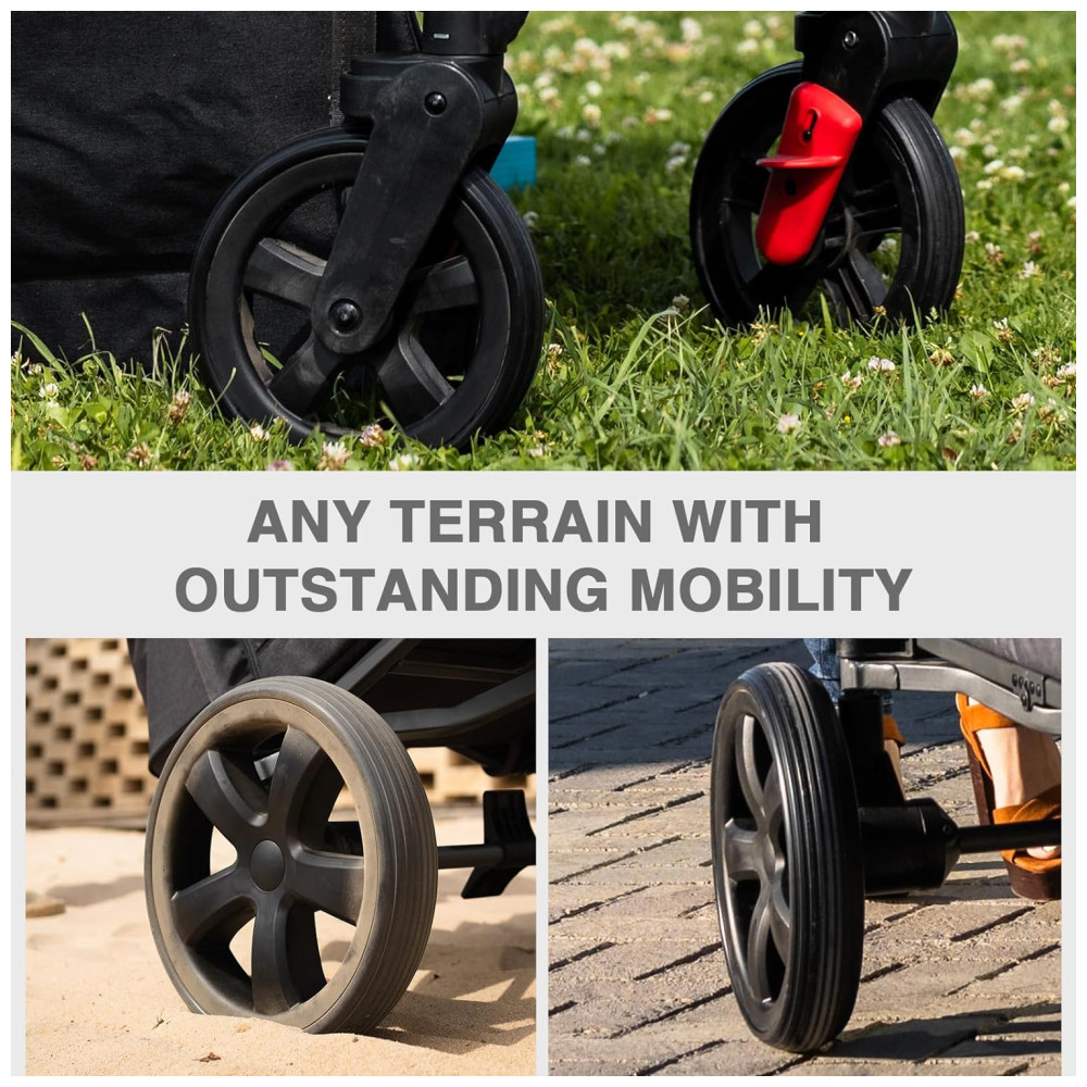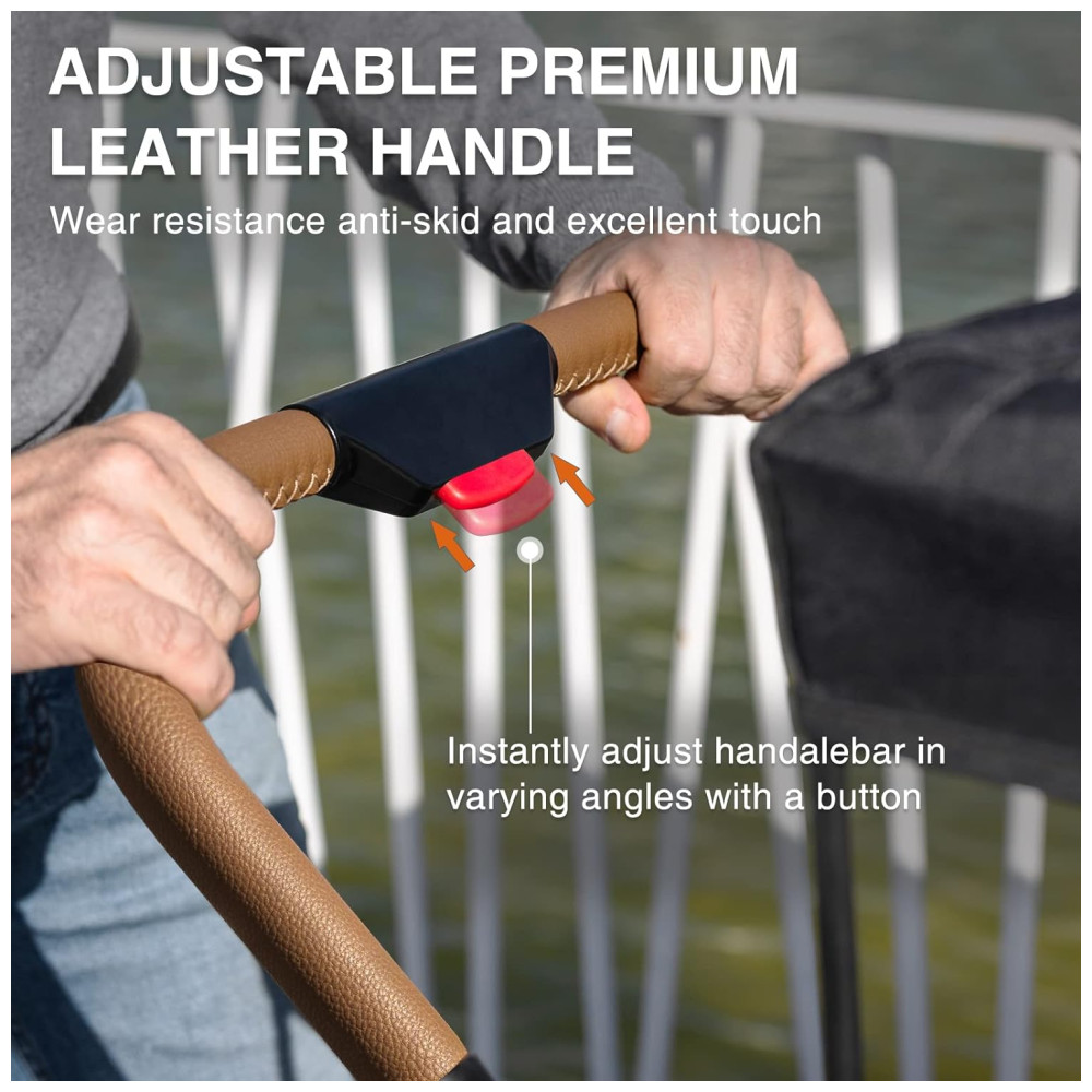 Manuseio Conveniente e Adaptabilidade Com um guiador de empurrar ajustável, projetado para pais de alturas variadas, e uma alça telescópica adaptável a terrenos acidentados ao ar livre, o carrinho é fácil de manusear em qualquer situação.