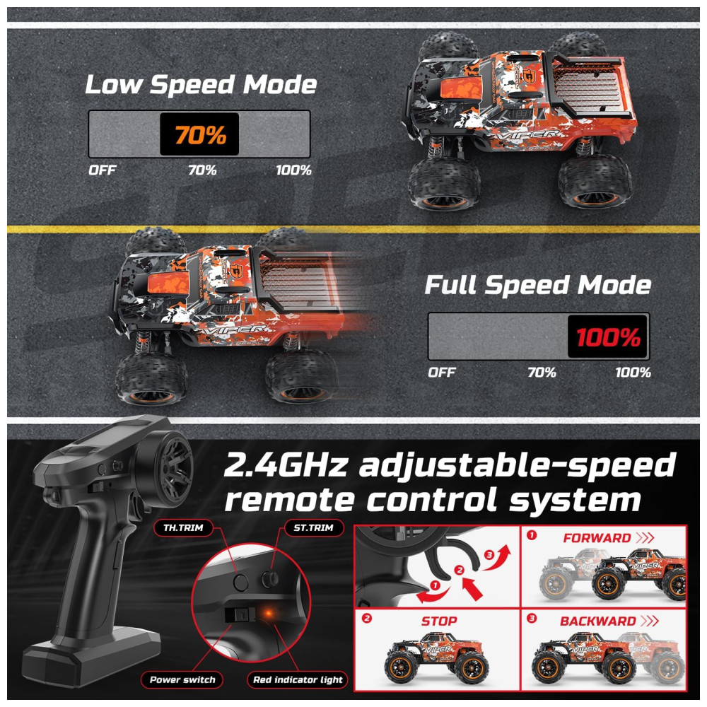 O controle remoto profissional de 2,4 GHz oferece um alcance de 45,59 metros sem interferência de sinal durante as corridas e permite que o usuário defina o limite de aceleração em 70 ou 100.