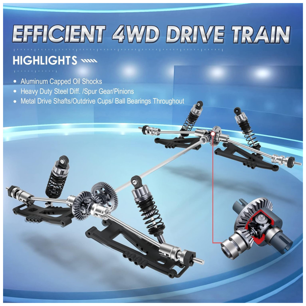 É um carro RC hobby para a prática de condução todo o terreno, como em terrenos de cascalho, estradas de concreto, areia ou grama.