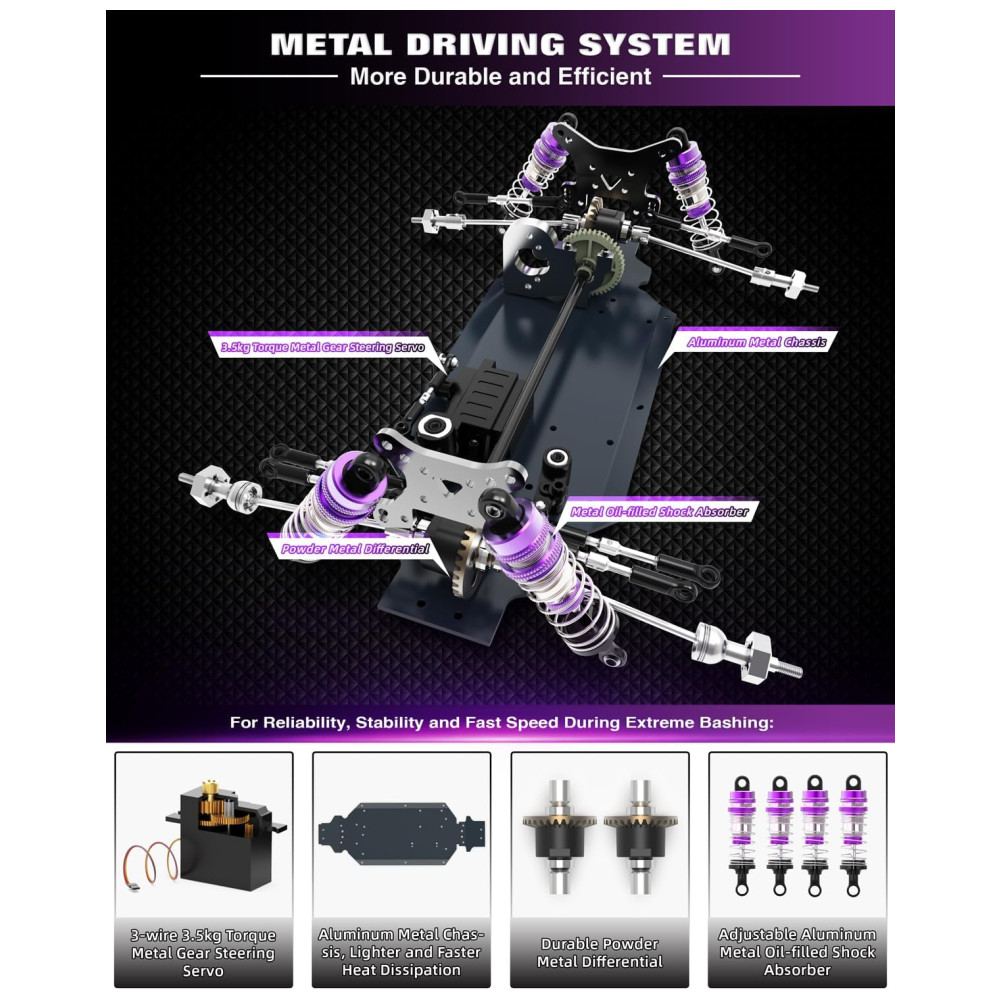 Este caminhão hobby 4WD RC foi projetado para extrema durabilidade, apresentando um sistema de acionamento de metal que inclui um servo de direção de 3 fios com engrenagem de metal e um torque de 3,5 KG, esticadores de metal ajustáveis, CVD frontal de metal e osso de cachorro traseiro, diferencial de metal em pó e engrenagem de dentes retos.