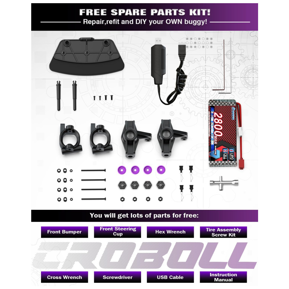 O Brushless RC Buggy vem com uma bateria recarregável de grande capacidade de 7,4V 25C 2800mAh e um cabo USB para manter a diversão por mais tempo.