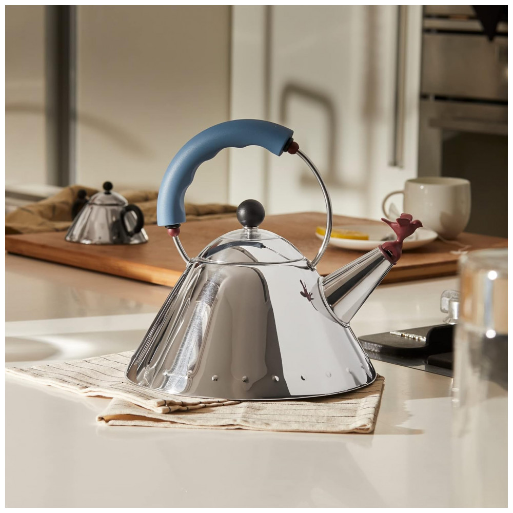 Chaleira 1.5L com Apito e Cabo ergonômico, Aço Inoxidável, ALESSI 9093, Azul: Designer Michael Graves Em PA, aço inoxidável 18, 10 Lavagem à mão sugerida Funciona em fogões de indução Dimensões 210 x