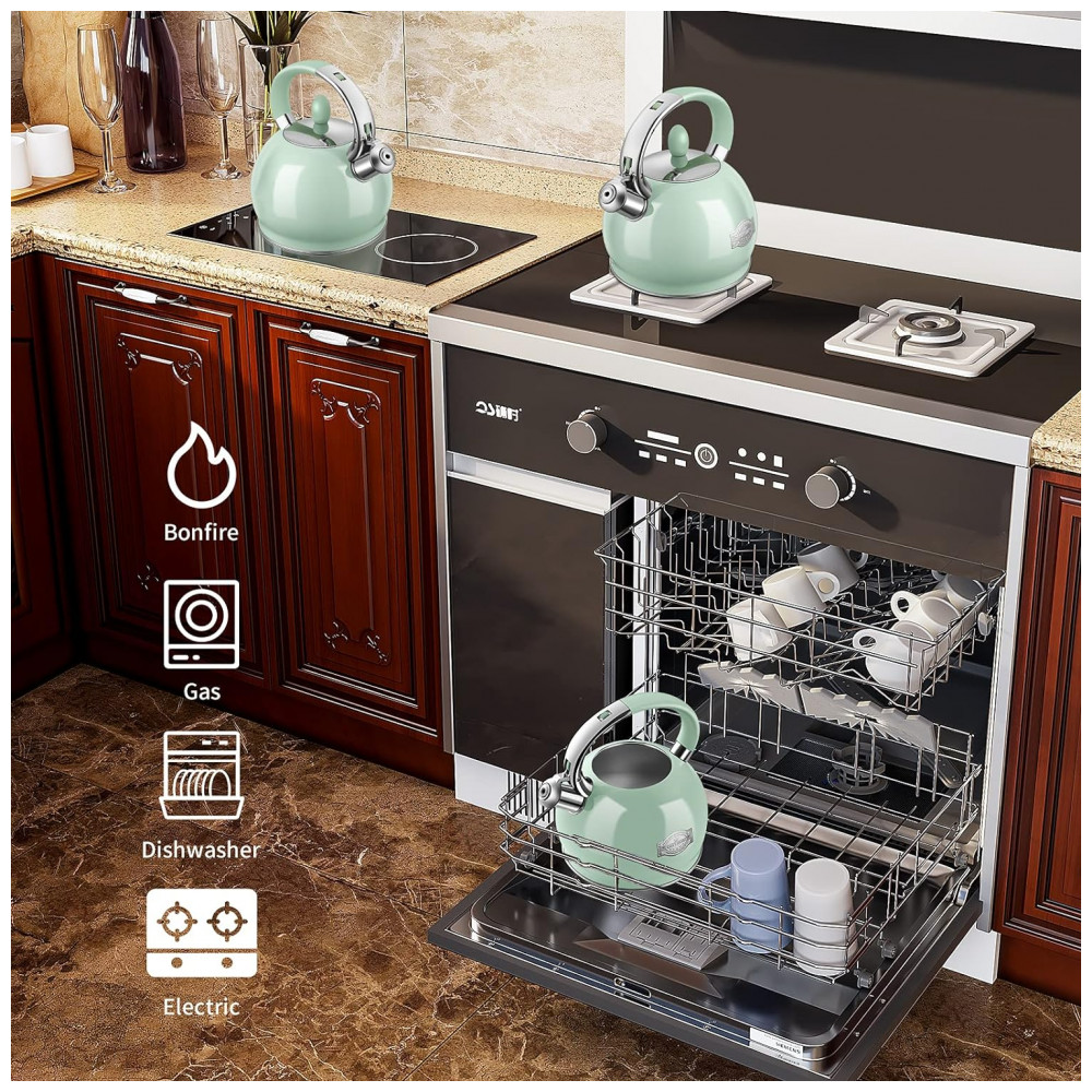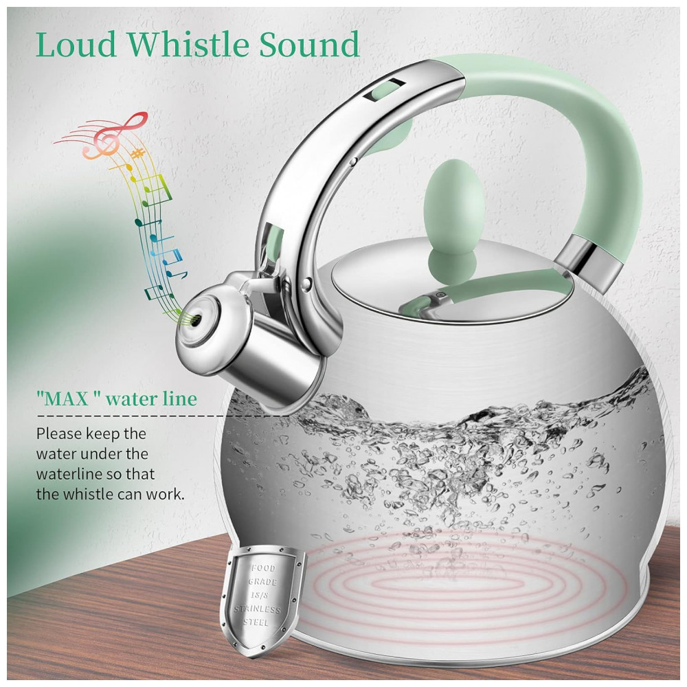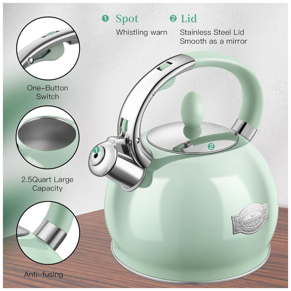 Chaleira de Chá 2.6L com Apito, Aço Inoxidável, RETTBERG VH 802, Verde: AÇO INOXIDÁVEL DE GRAU ALIMENTAR E VIDA LONGA Bule para fogão feito de acabamento profissional de qualidade alimentar e artesanato em aço inoxidável 304, garante que as chaleiras sejam resistentes à ferrugem e à corrosão.