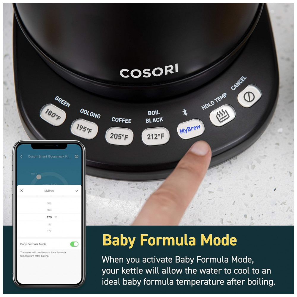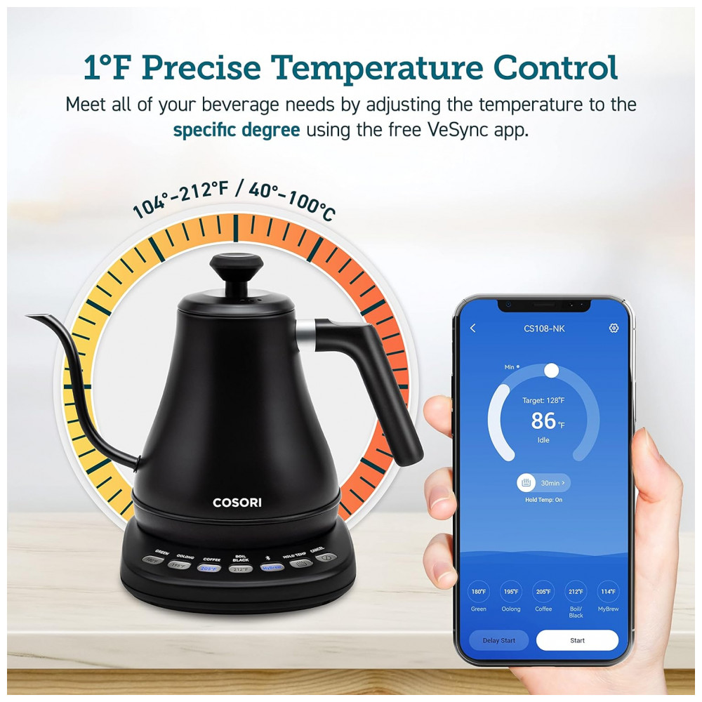 Chaleira Elétrica 0.8 L com Desligamento Automático, 110v, COSORI Electric Gooseneck Kettle, Preto: Funções inteligentes desfrute do controle total da sua chaleira através do seu smartphone conectando a ao aplicativo gratuito VeSync.