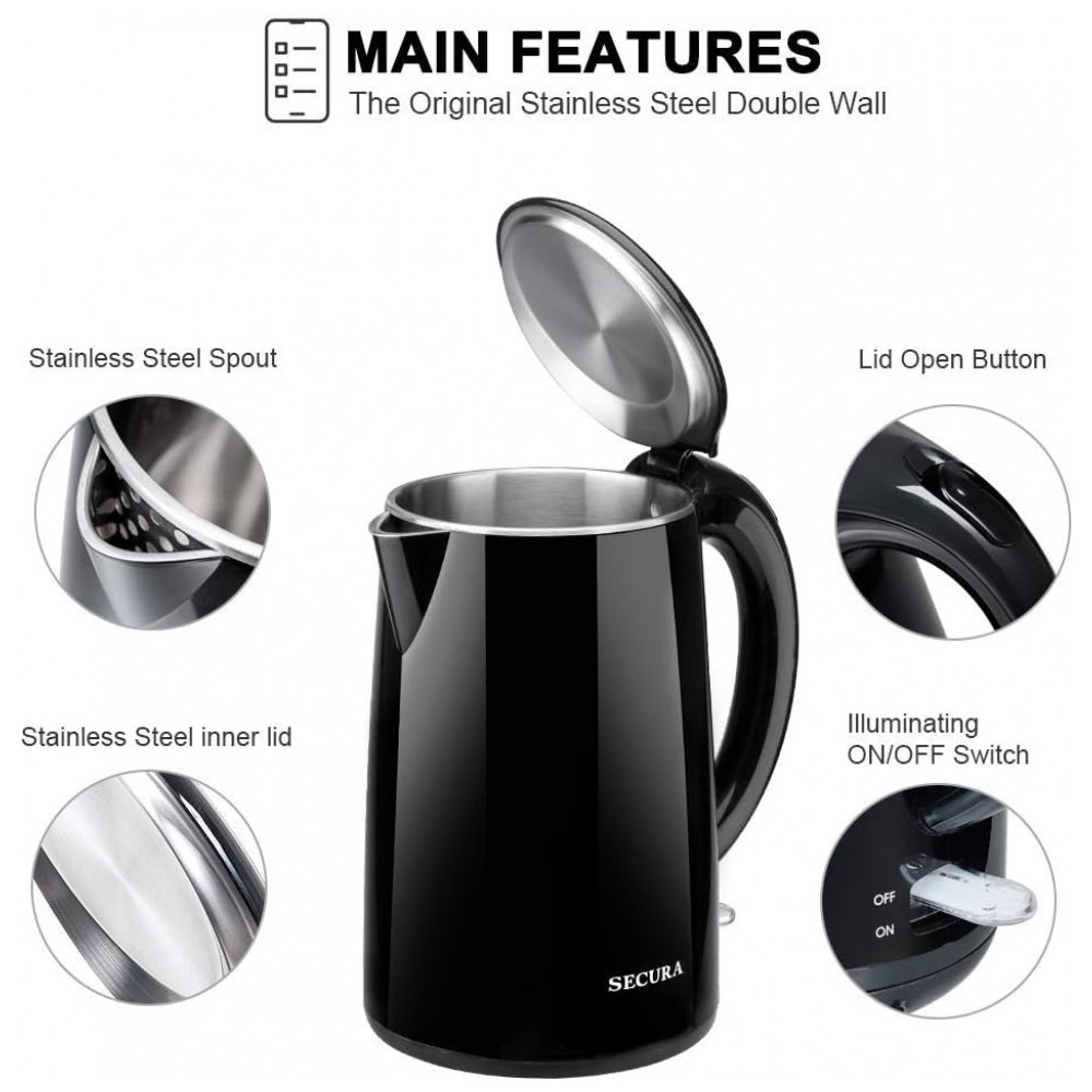 Chaleira Elétrica 1.7L, Aço Inoxidável, 110v, SECURA SWK 1701DA, Preto