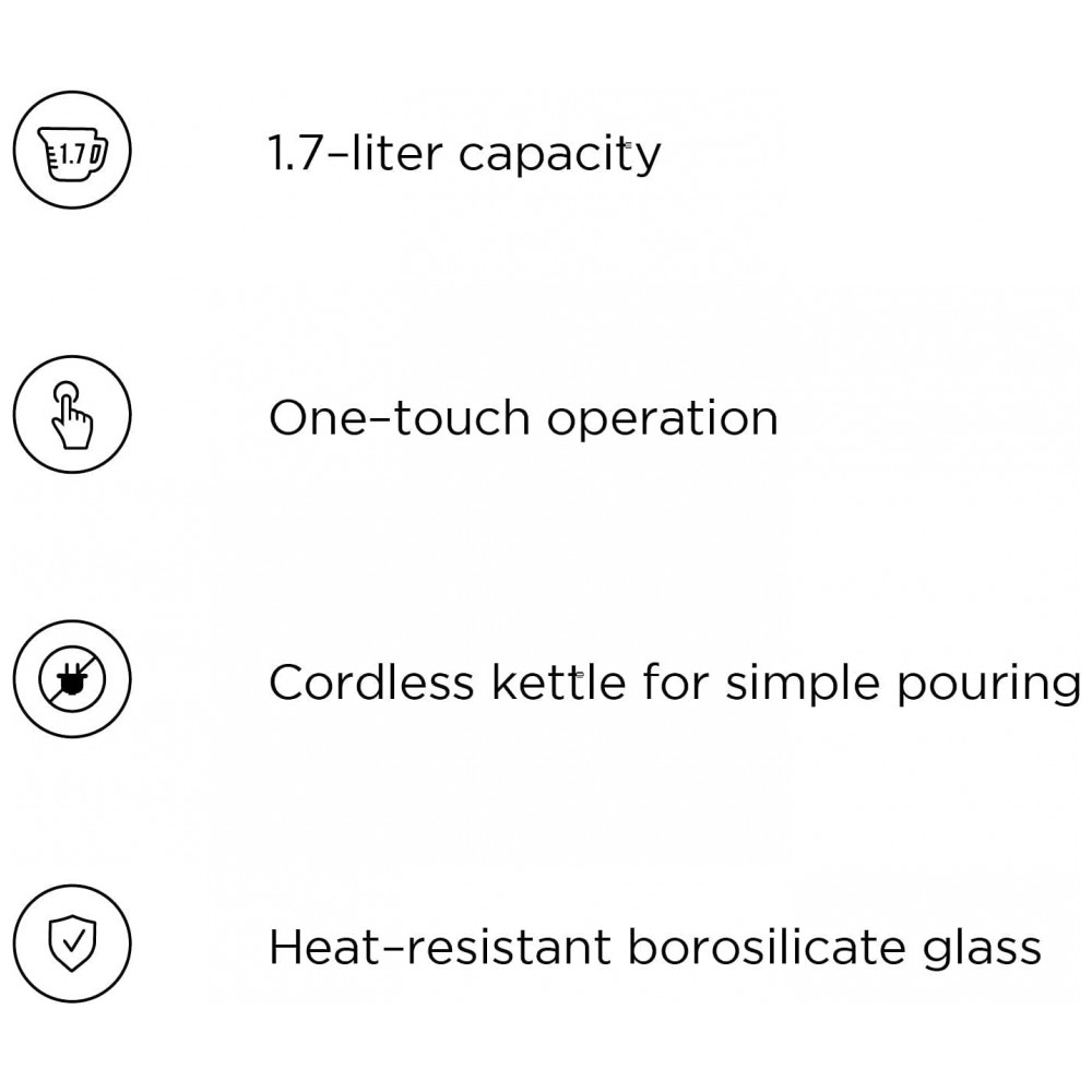 SLEEK STYLISH O acabamento em preto fosco, o corpo sem fio e o vidro transparente tornam esta chaleira no complemento perfeito para sua bancada.