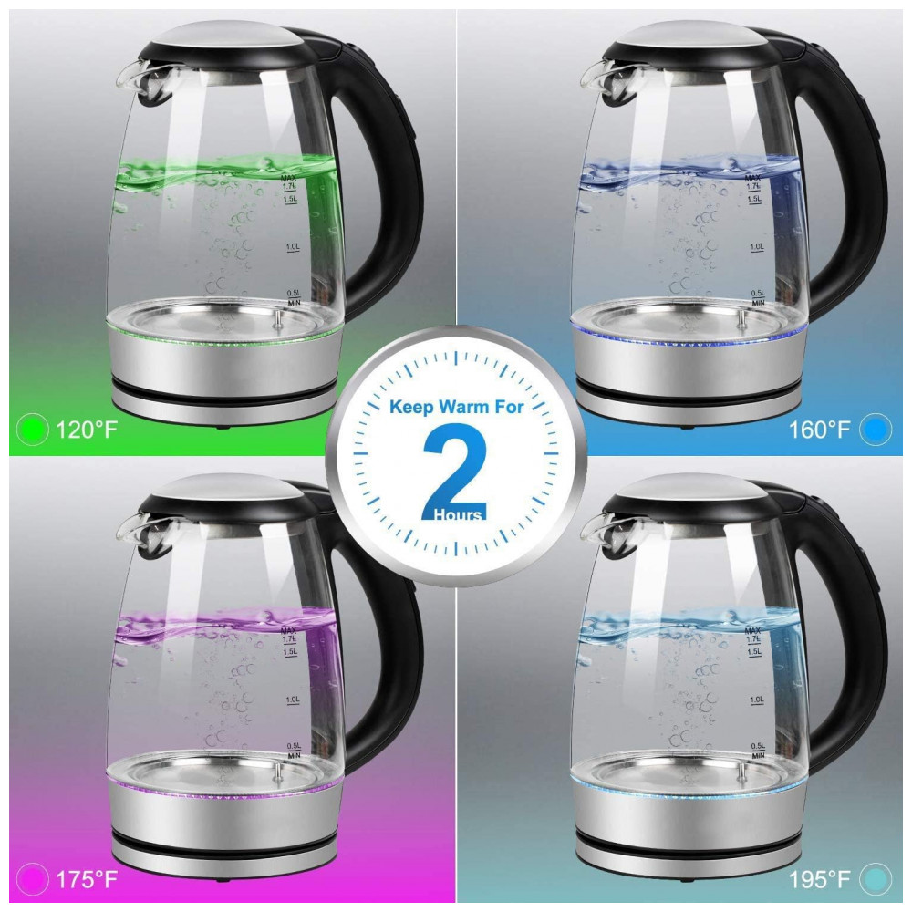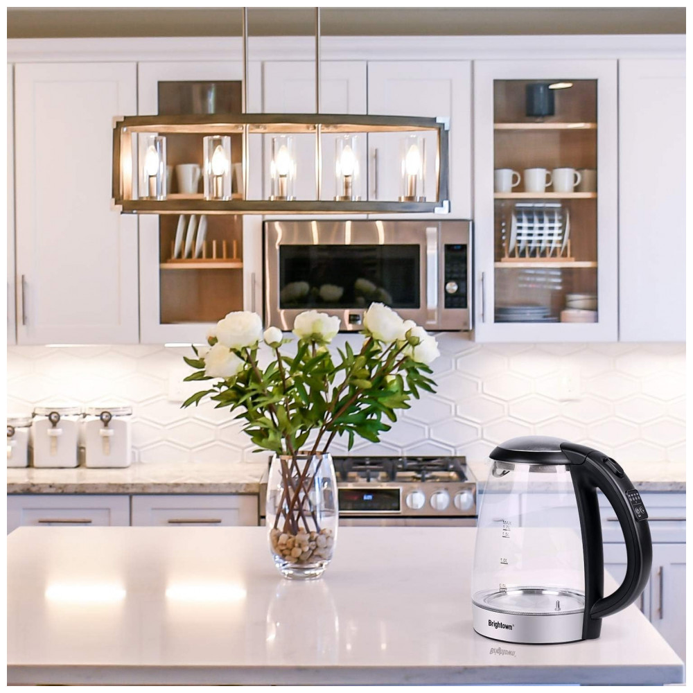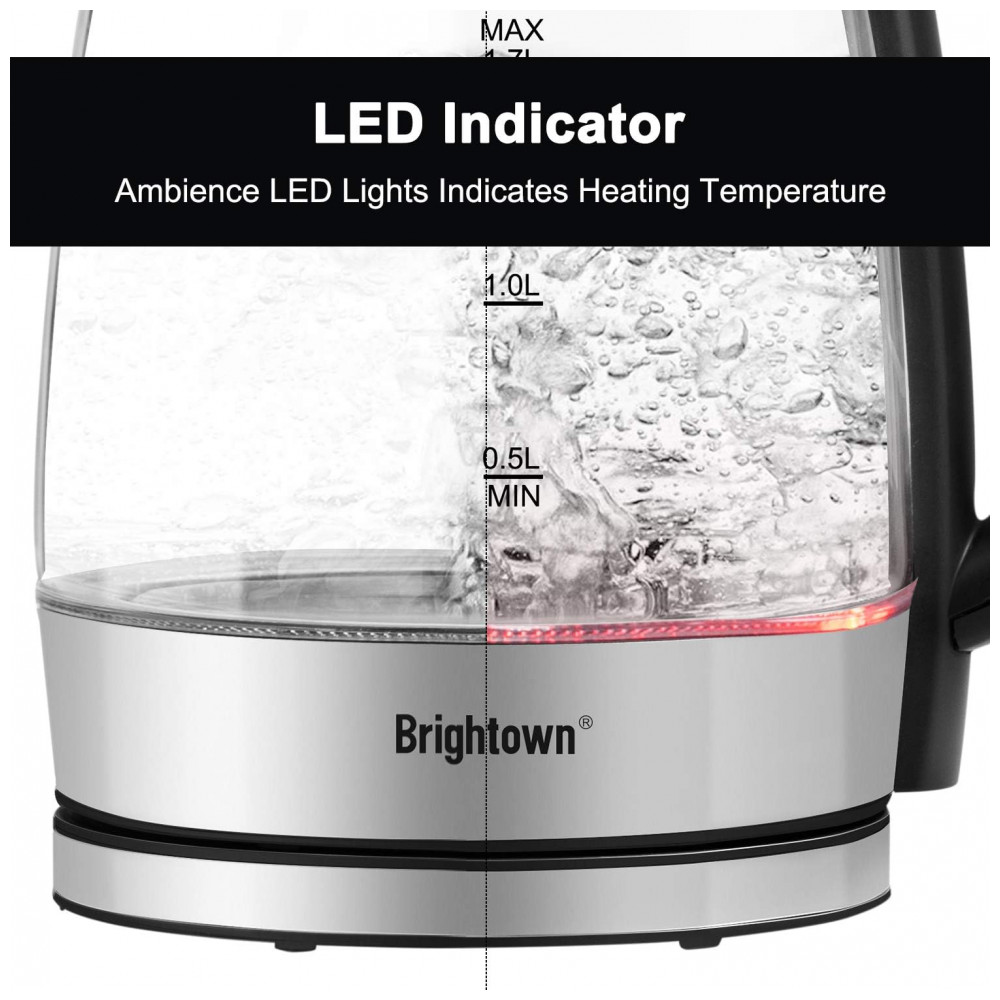 Chaleira Elétrica 1.7L com Desligamento Automático, Aço Inoxidável, 1500W, 110v, BRIGHTOWN, Preto: Alta qualidade e sem plástico a garrafa de água quente é feita de vidro de borosilicato de alta qualidade e material de aço inoxidável 304 de grau alimentício, que é , ecológico e pode ser com confiança.