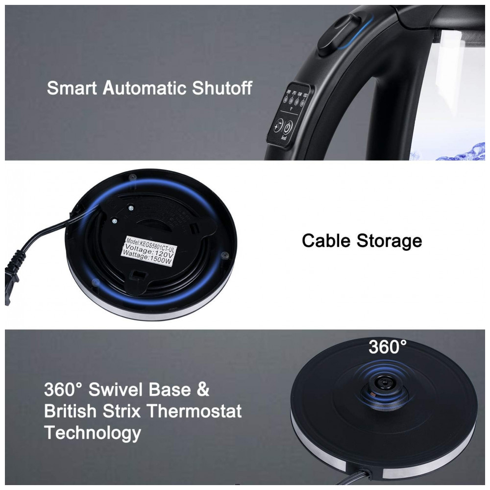 O elemento de controle de temperatura é a tecnologia de termostato British Strix, função avançada de desligamento automático e proteção contra fervura a seco, 100 de garantia de segurança elétrica, mais economia de energia do que o fogão de indução ou fogão elétrico, portanto, tem uma vida útil mais longa do que a chaleira comum.