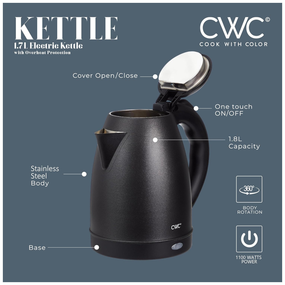 Chaleira Elétrica 1,7L em Aço Inoxidável com Fervura Rápida, Desligamento Automático e Base Giratória, 1100W, COOK WITH COLOR, Preta