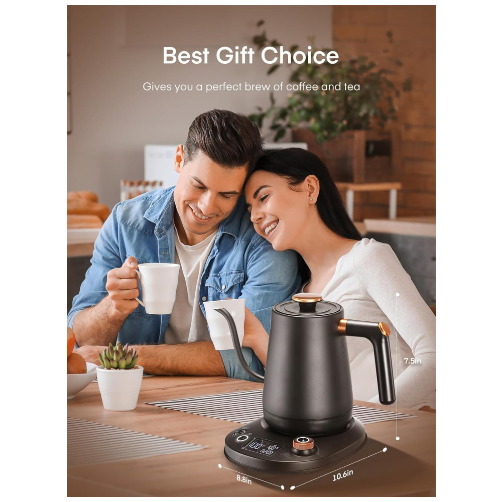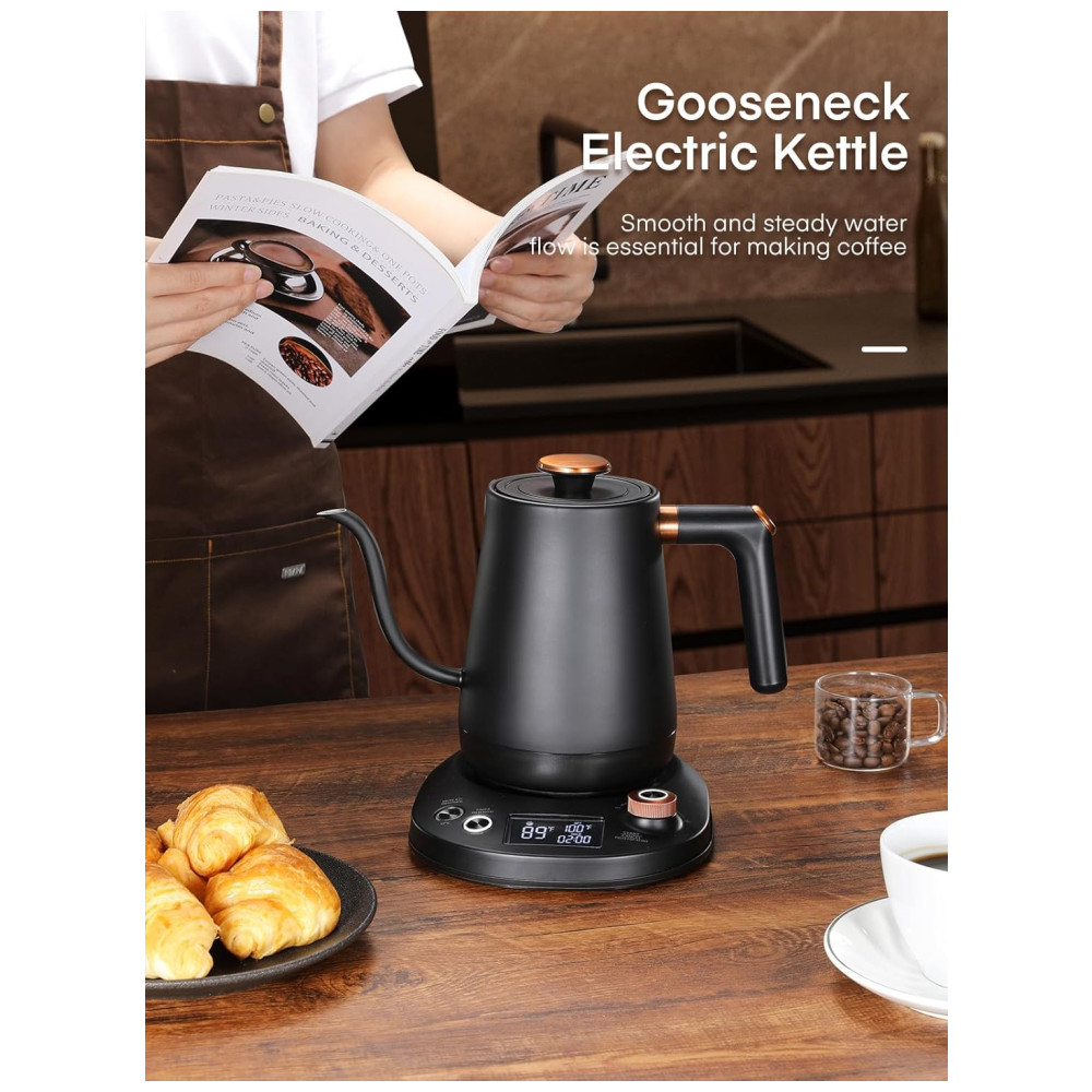 Chaleira Elétrica 800mL Pescoço de Ganso com Controle de Temperatura, Interior de Aço Inoxidável e Display LCD, 1200W, Aiheal, Preto Fosco: Chaleira eletrica pescoco de ganso elegante para controle preciso.