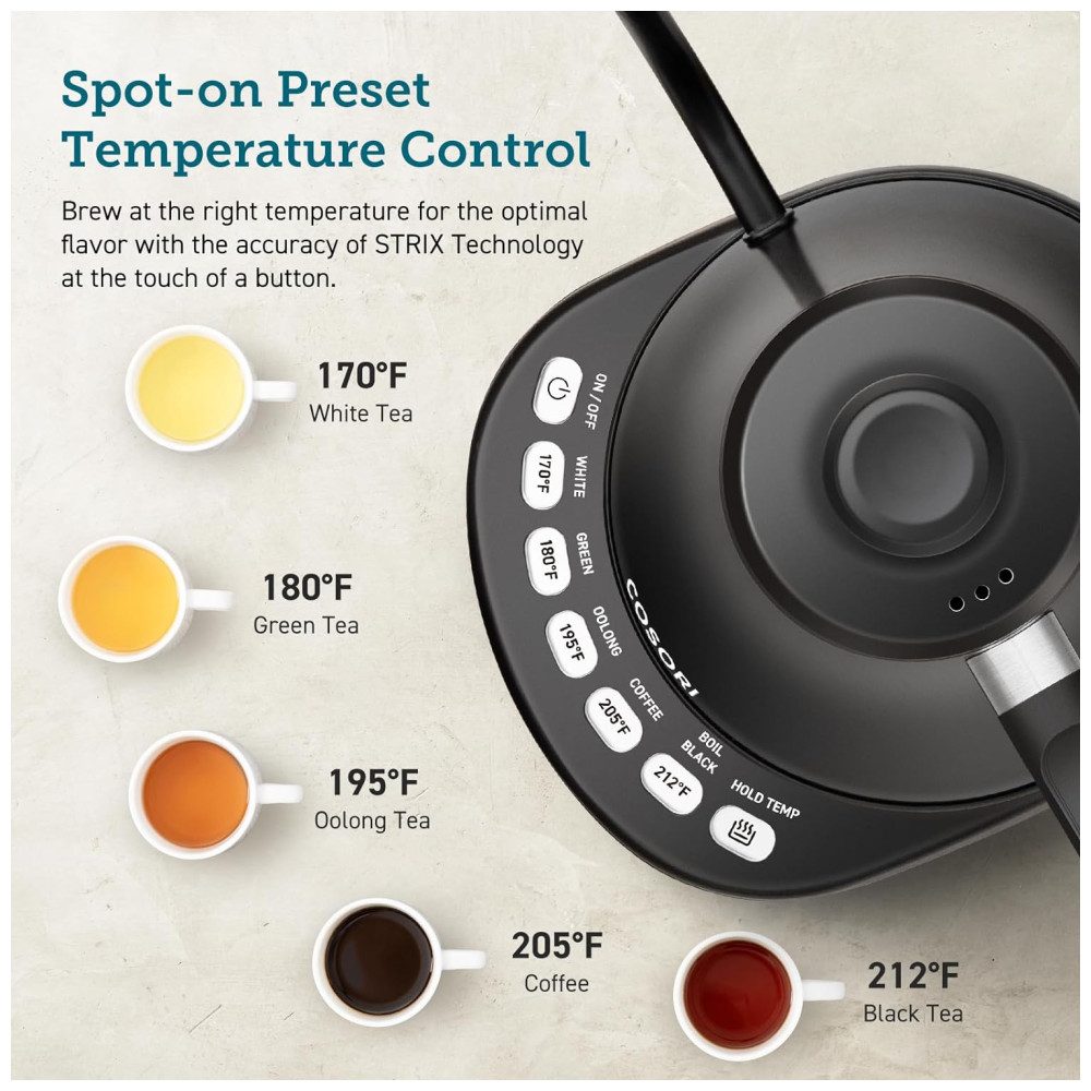 A Chaleira de pescoço de ganso deste Cosori apresenta 5 predefinições de temperatura precisas.