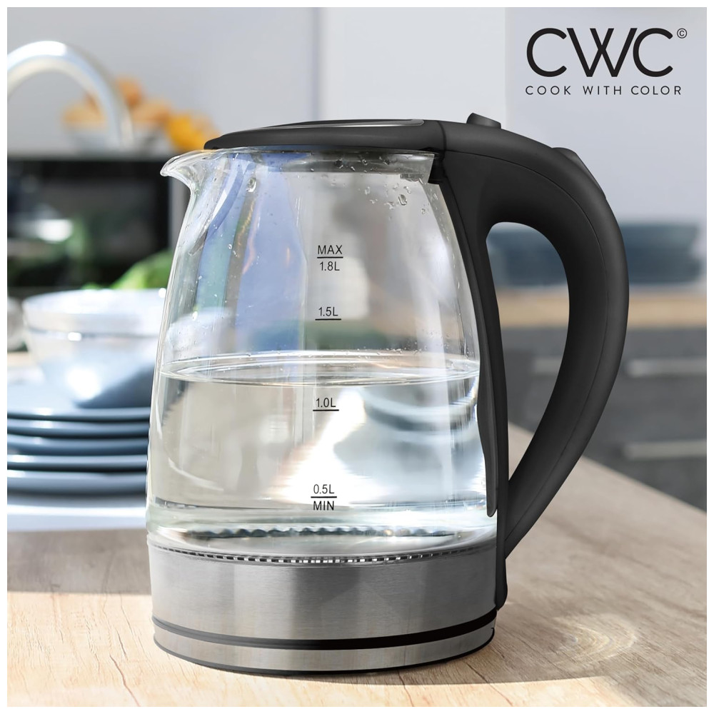 Chaleira Elétrica de Vidro 1,8L Fervura Rapida e Segura com Design Moderno e Pratico, Ideal para Cozinhar com Estilo, 1200W, COOK WITH COLOR, Preta: Desfrute de uma xicara fumegante de sua bebida quente favorita em menos de 3 minutos com os potentes 1200 Watts desta chaleira eletrica.