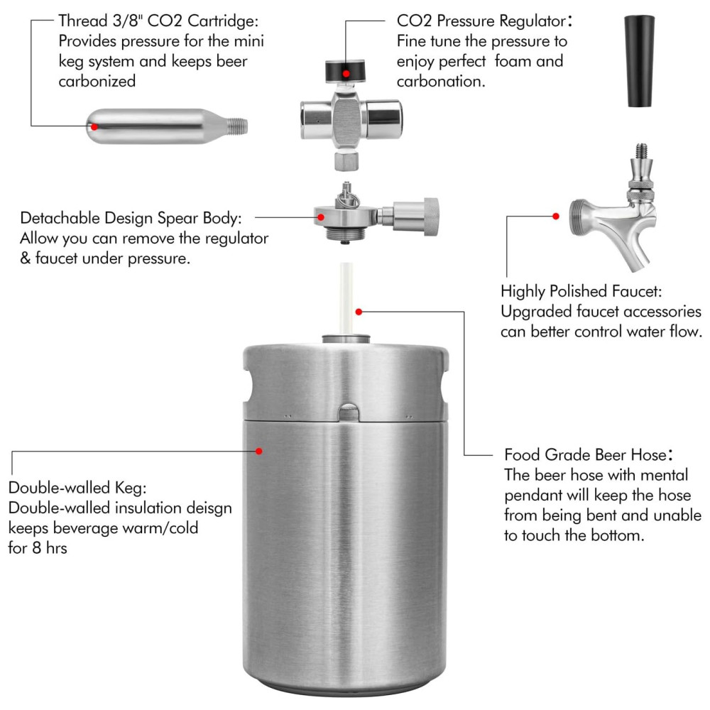 O kit dispensador de torneira growler para tanque de bebida é construído com aço inoxidável 304 de qualidade alimentar que mantém os sabores da cerveja e frescos MANTENHA A CERVEJA FRESCA O mini sistema dispensador pode manter a pressão de vácuo no barril e manter a frescura por poucas bocas.