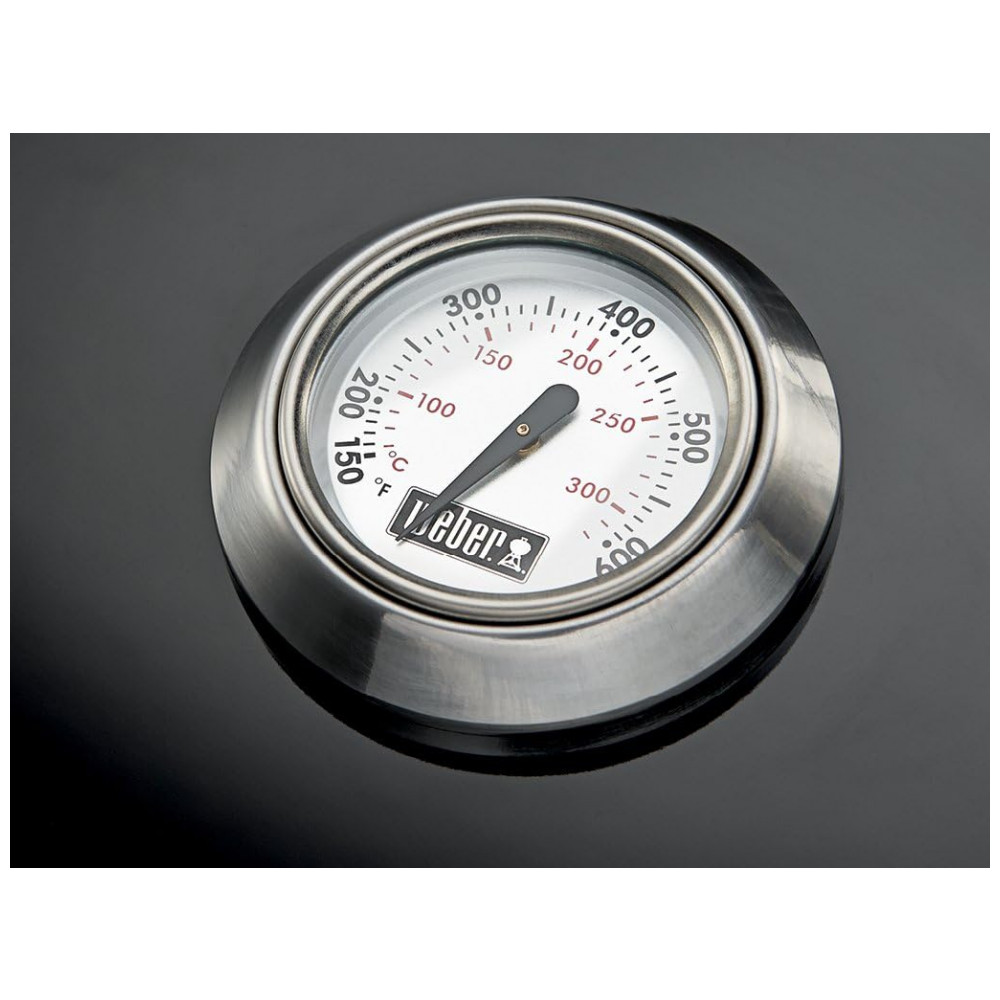Termômetro de tampa embutido exibe a temperatura interna da sua grade.
