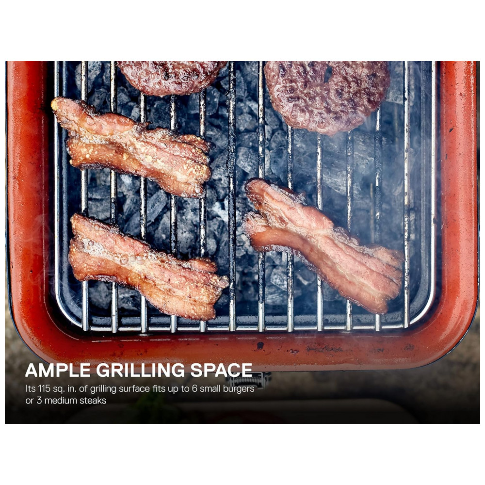 FÁCIL DE LIMPAR A grelha removível, a bandeja para carvão e a caixa de fogo esmaltada de porcelana são o conjunto perfeito para este pequeno grelhador a carvão.