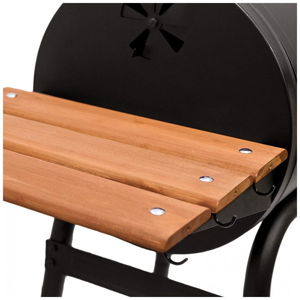 160 centímetros ao quadrado de espaço para cozinhar, grelhas de ferro fundido, gaveta lateral Ideal para pequenos decks ou pátios Possui alça de madeira Stay Cool, prateleira later…