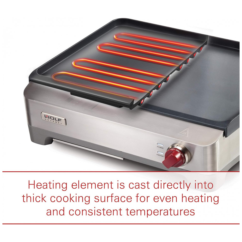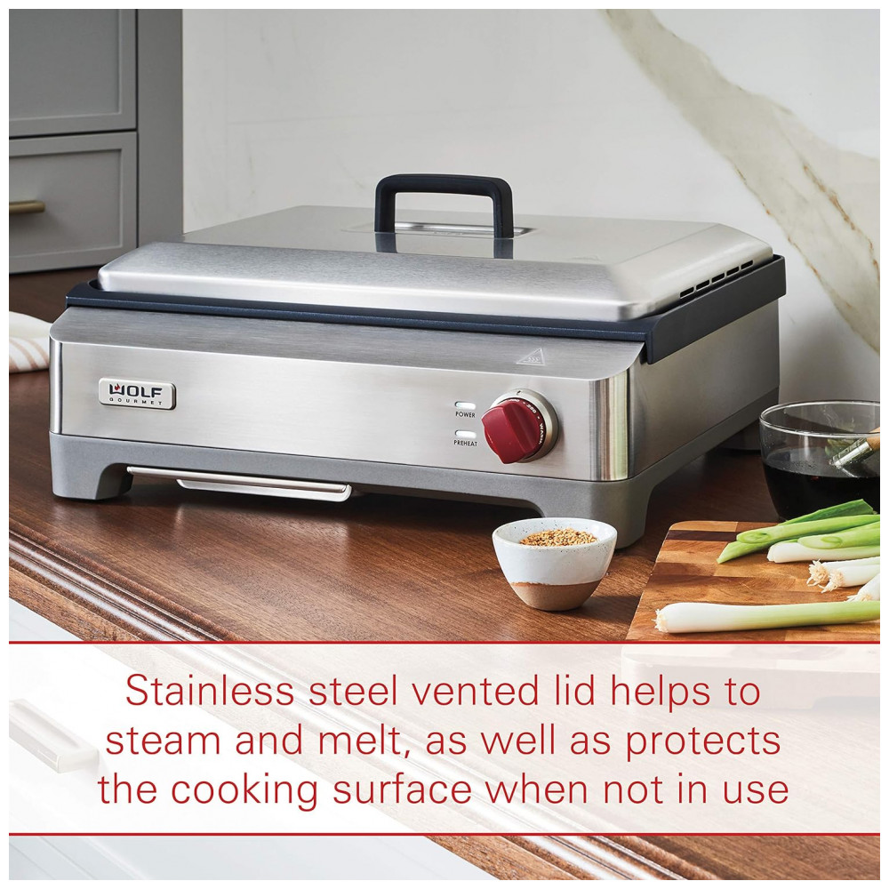 Churrasqueira Elétrica Antiaderente com Controle de Temperatura, 1500W, 110v, WOLF GOURMET WGGR100S, Prateado: COZINHAR VERSÁTIL NO SEU MELHOR Grelhe, grelhe, refogue, cozinhe no vapor e derreta alimentos com confiança na superfície de cozimento antiaderente superior de 204 polegadas quadradas.