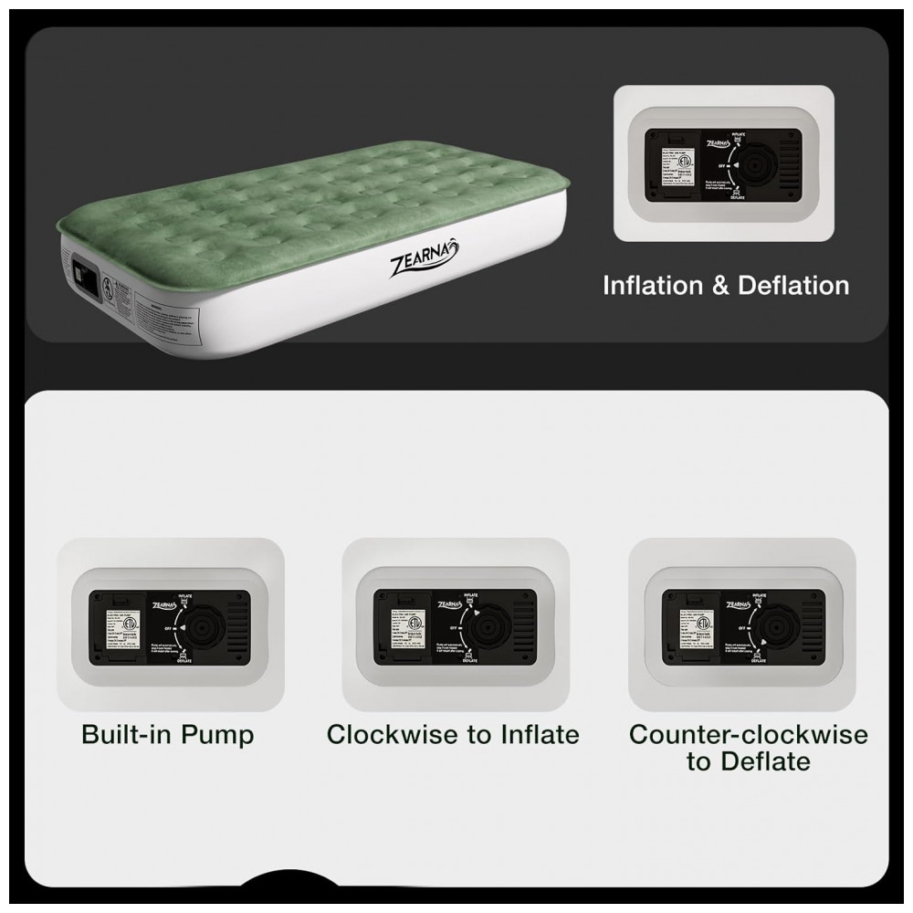 Colchão Inflável Solteiro com Bomba Embutida, Para até 250KG, Zearna, Verde: MAIS PRÁTICO Nosso colchão de ar à prova dágua premium pode ser como colchão de chão em casa, como cama portátil em viagens ou até mesmo como colchão de acampamento ao ar livre.