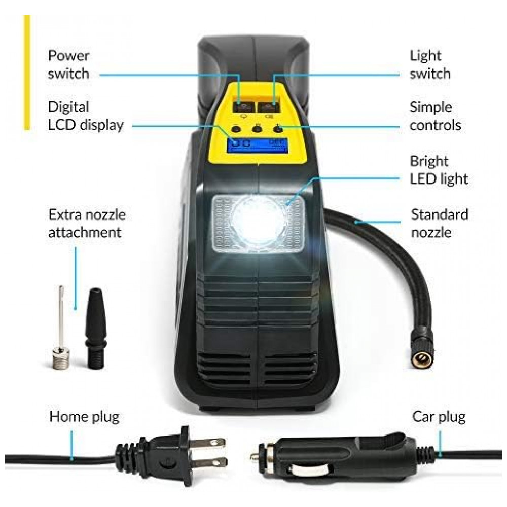 Compressor de Ar Elétrico Mini Portátil, 12V, com LCD e Led de emergência, 120W, 90 PSI, 110v, KENSUN EHRComp A58A, Preto: INFLAÇÃO RÁPIDA Com a engenharia avançada da Kensun, o motor de metal sólido de 120 W fornece potência excelente, o que tornará a inflação do pneu super rápida e fácil.