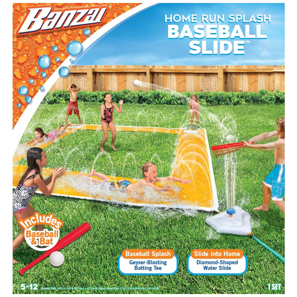 Conjunto de Beisebol Inflável com Escorregador, Bola e Bastão, Idade 5 Anos ou Mais, BANZAI: O Slide de Beisebol Grand Slam Divirta se com suas atividades favoritas de verão combinadas em uma só O Slide de Beisebol Grand Slam é a escolha perfeita para aqueles que amam beisebol e diversão aquática.