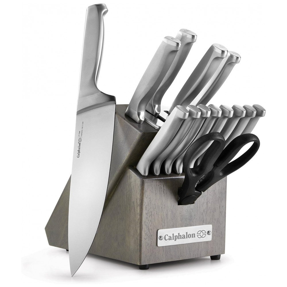 Conjunto de Facas com Afiador Embutido e Bloco de Bancada 15 Peças, CALPHALON 2017942, Prateado: Construção de faca de aço inoxidável completa Espiga cheia.