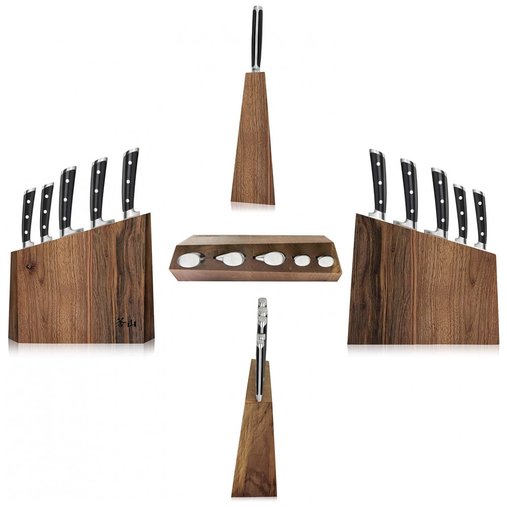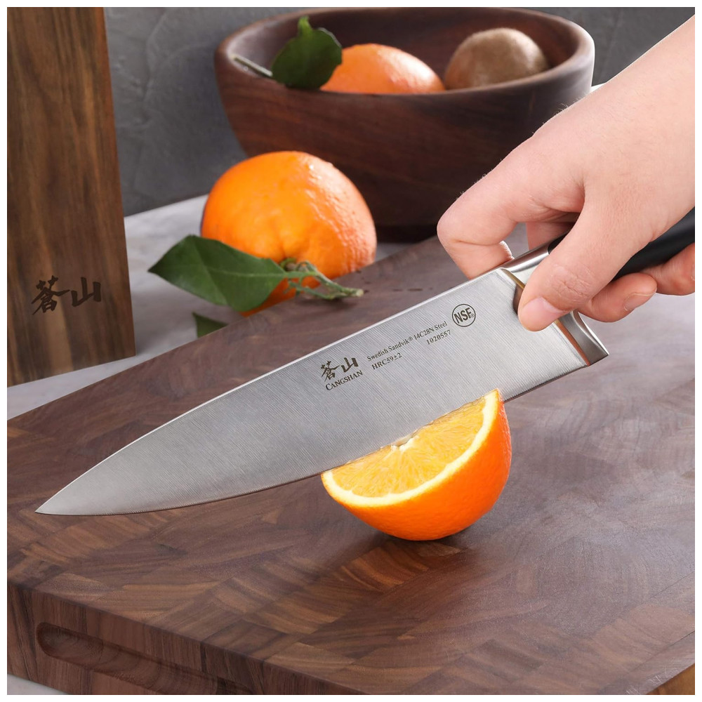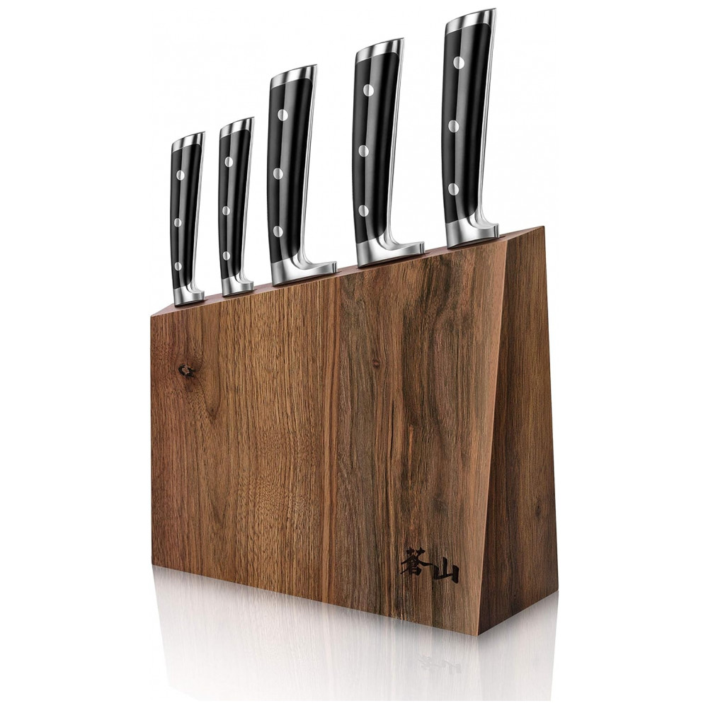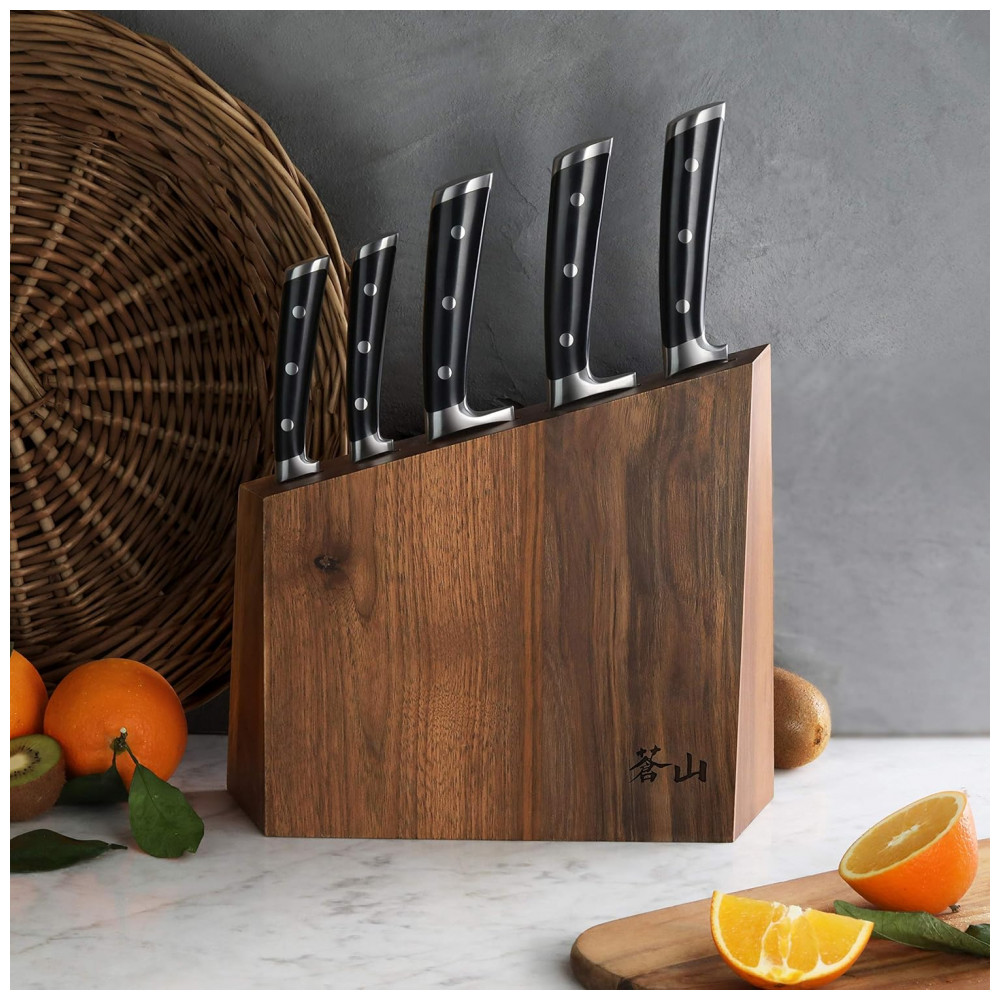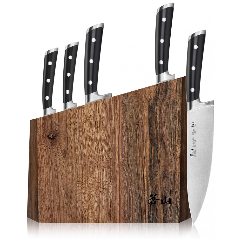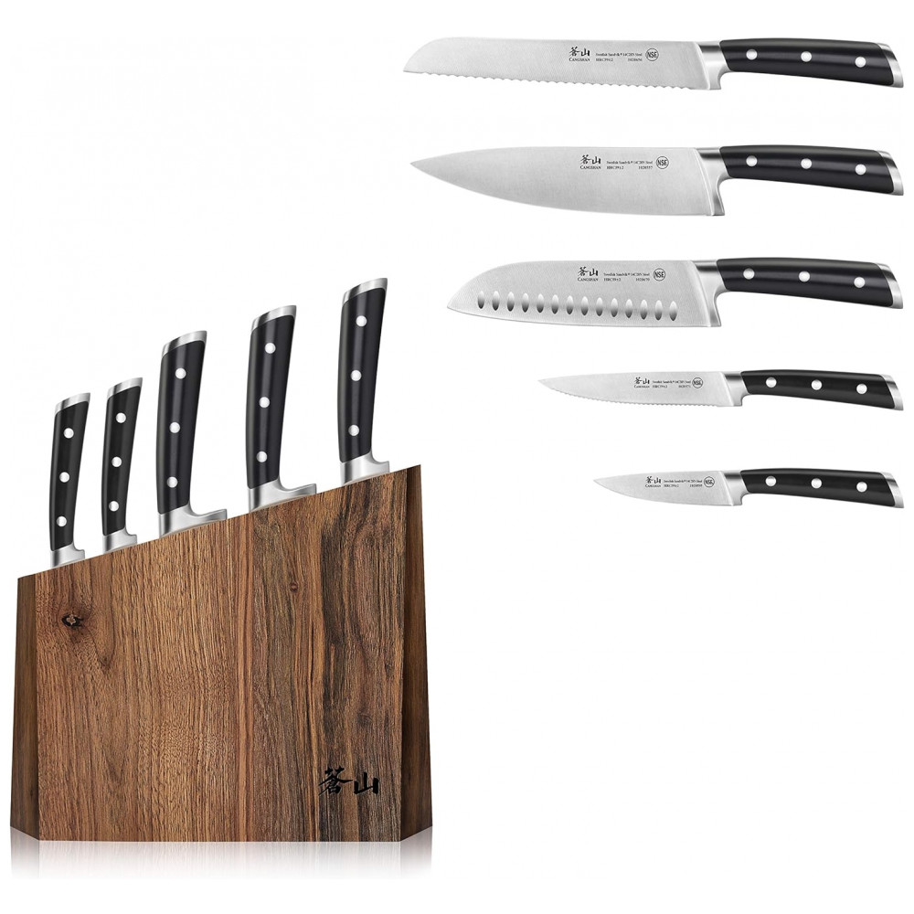 Conjunto de Facas com Bloco de Bancada Multinível, 6 Peças, CANGSHAN 1024876, Preto: Facas full tang artesanais forjadas em aço sueco Sandvik 14C28N de grão fino para incrível durabilidade, resistência a manchas e excepcional retenção de borda.