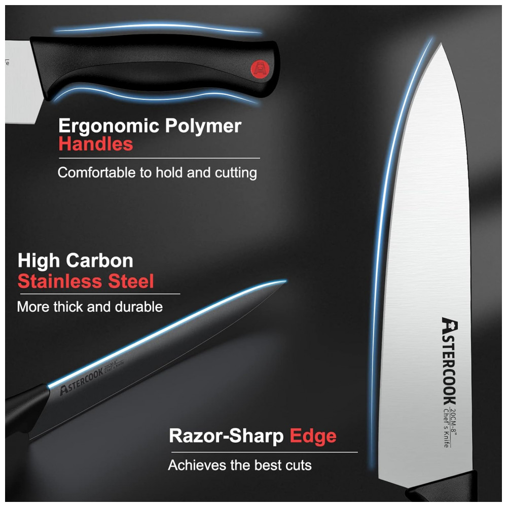 Conjunto de Facas em Aço Inoxidável com Afiador Embutido e Bloco de Bancada 14 Peças, ASTERCOOK K15016P, Preto: CONJUNTO DE FACA DE COZINHA DE ALTA QUALIDADE Este conjunto de talheres de aço inoxidável de alto carbono é manchado e resistente à ferrugem, que pode suportar o uso de alta frequência ou uso após longos períodos de inatividade.