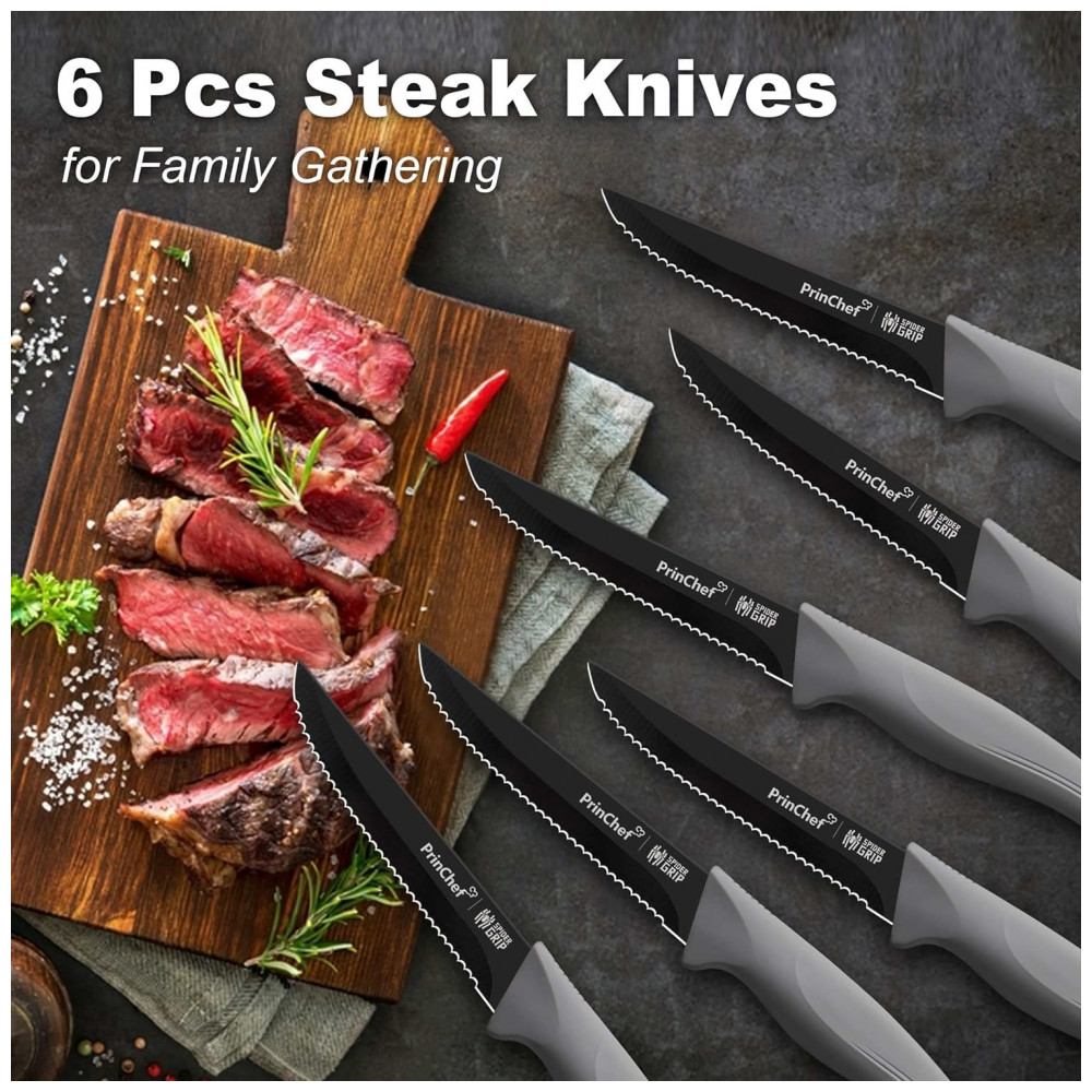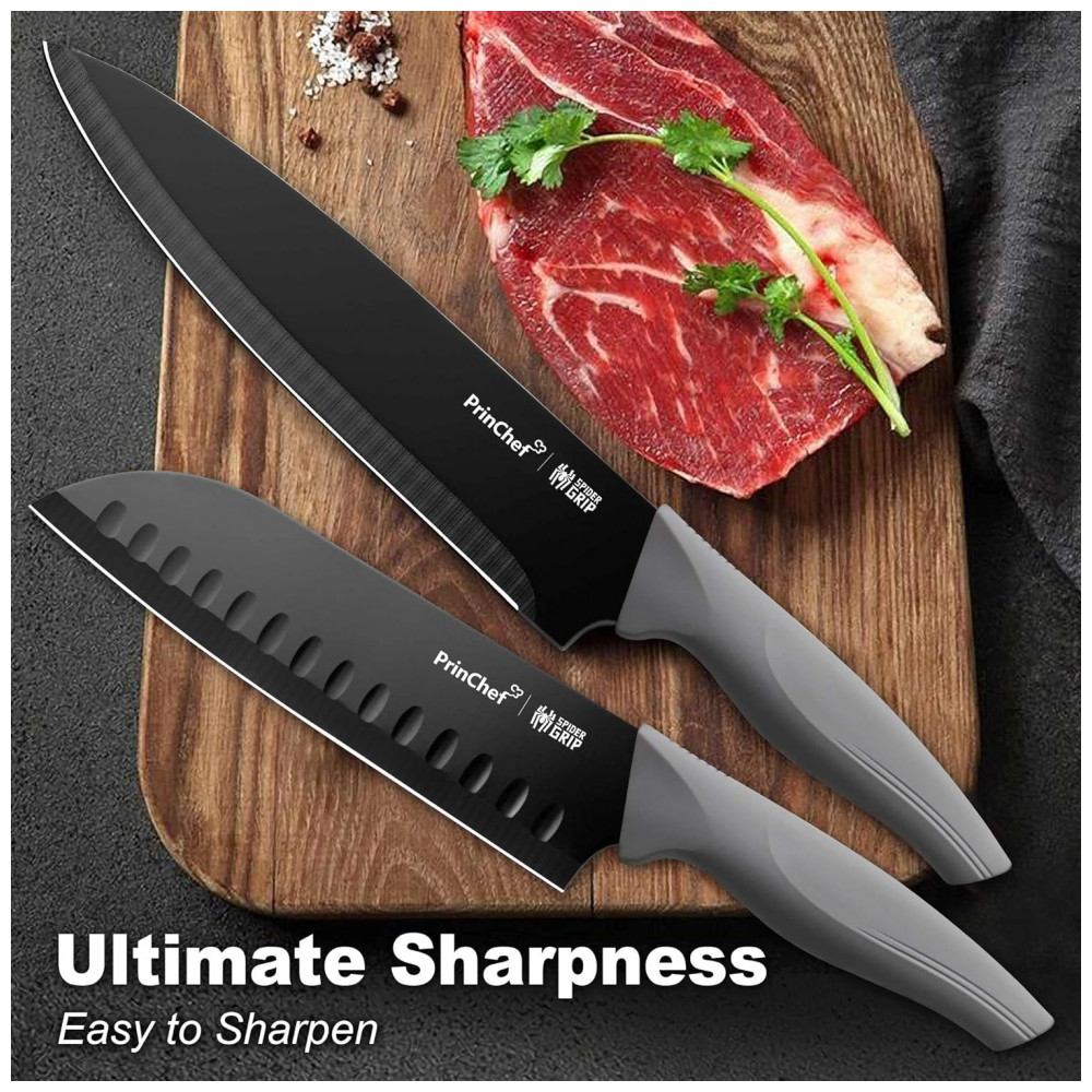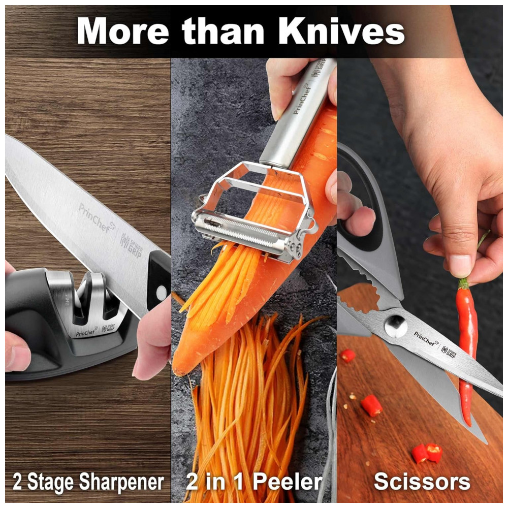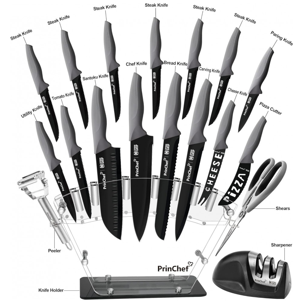 Conjunto de Facas em Aço Inoxidável com Bloco de Bancada, 19 Peças, PRINCHEF LT 109, Cinza: Nitidez é a chave Cansado de usar suas velhas facas de cozinha rombas É hora de substituí los por uma nova faca afiada com amolador Forjadas em aço inoxidável de alto carbono premium, polido à mão 15 por artesãos habilidosos, todas as facas apresentam nitidez máxima para cortes precisos.