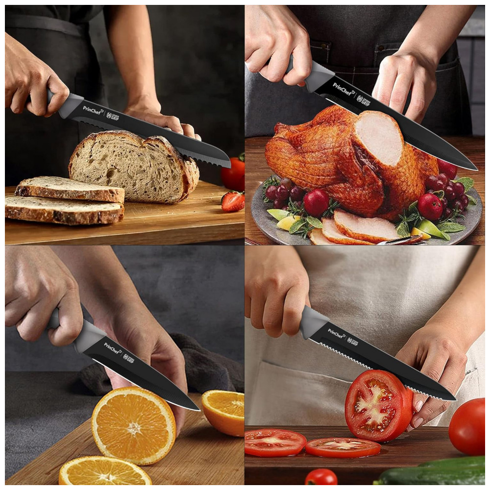 Lâmina preta com cabo cinza parece mais elegante e combina bem com sua cozinha moderna.