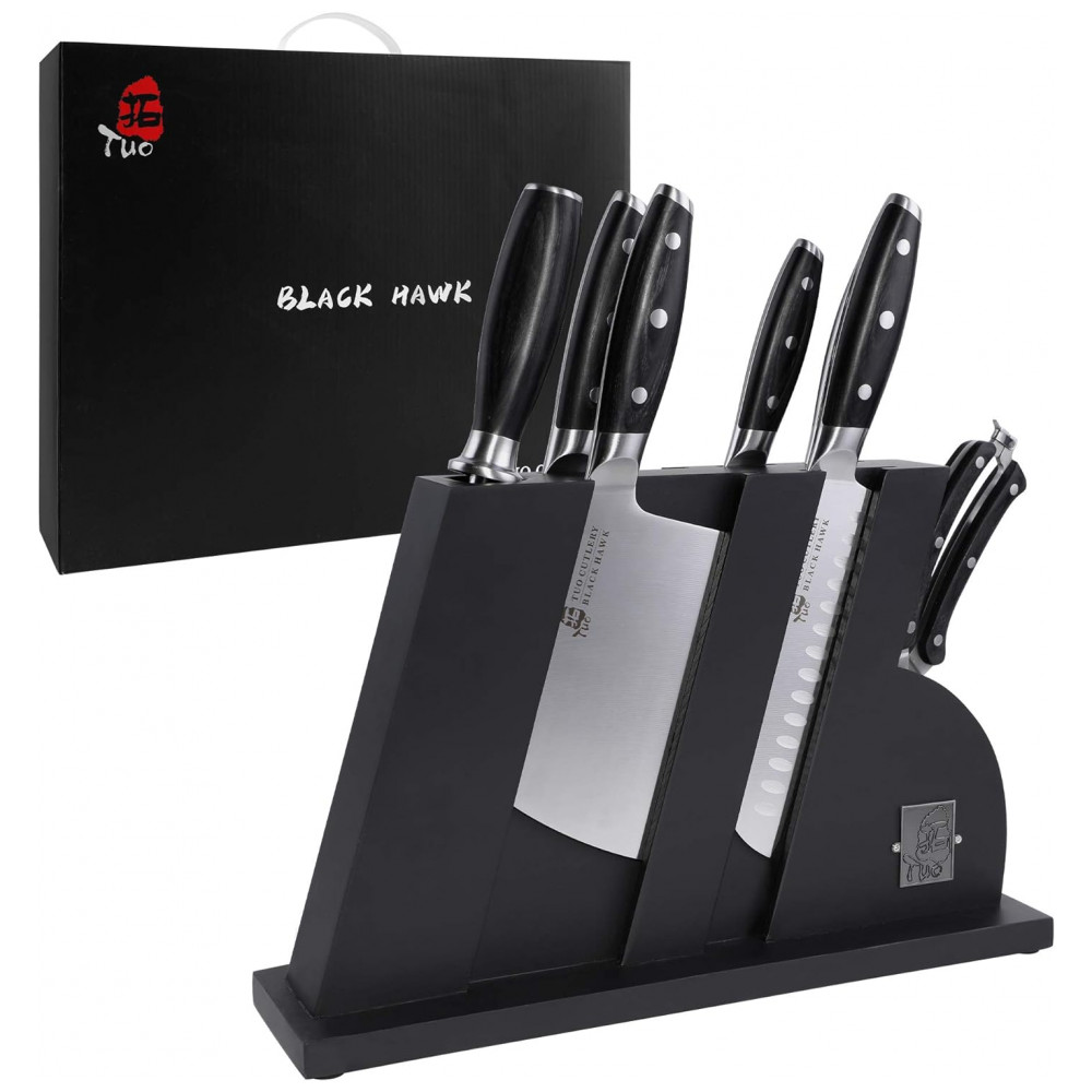 Conjunto de Facas em Aço Inoxidável com Bloco de Bancada, 8 Peças, TUO, Preto: DIGA ADEUS À DESORDEM Todas as facas de cozinha podem ser cuidadosamente zenadas em blocos de madeira de borracha natural para economizar espaço valioso, tornando sua cozinha mais arrumada.