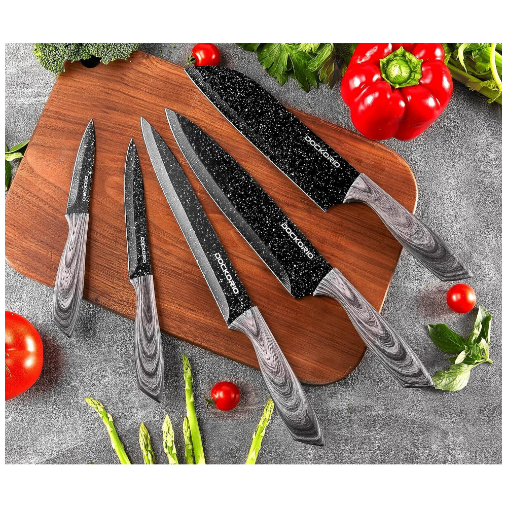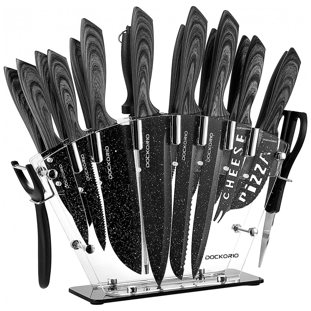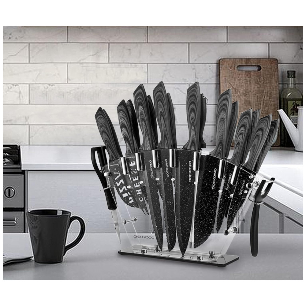 Conjunto de Facas em Aço Inoxidável com Bloco de Bancada, Peças, DOCKORIO knife set 19 601 Grey, Cinza: Matéria prima de qualidade e lâminas afiadas feitas de aço inoxidável de alto carbono 3CR14 é forjado a partir de uma peça sólida de aço Processa o aço de uma maneira específica para garantir que tenha uma alta dureza de 52 Rockwell.