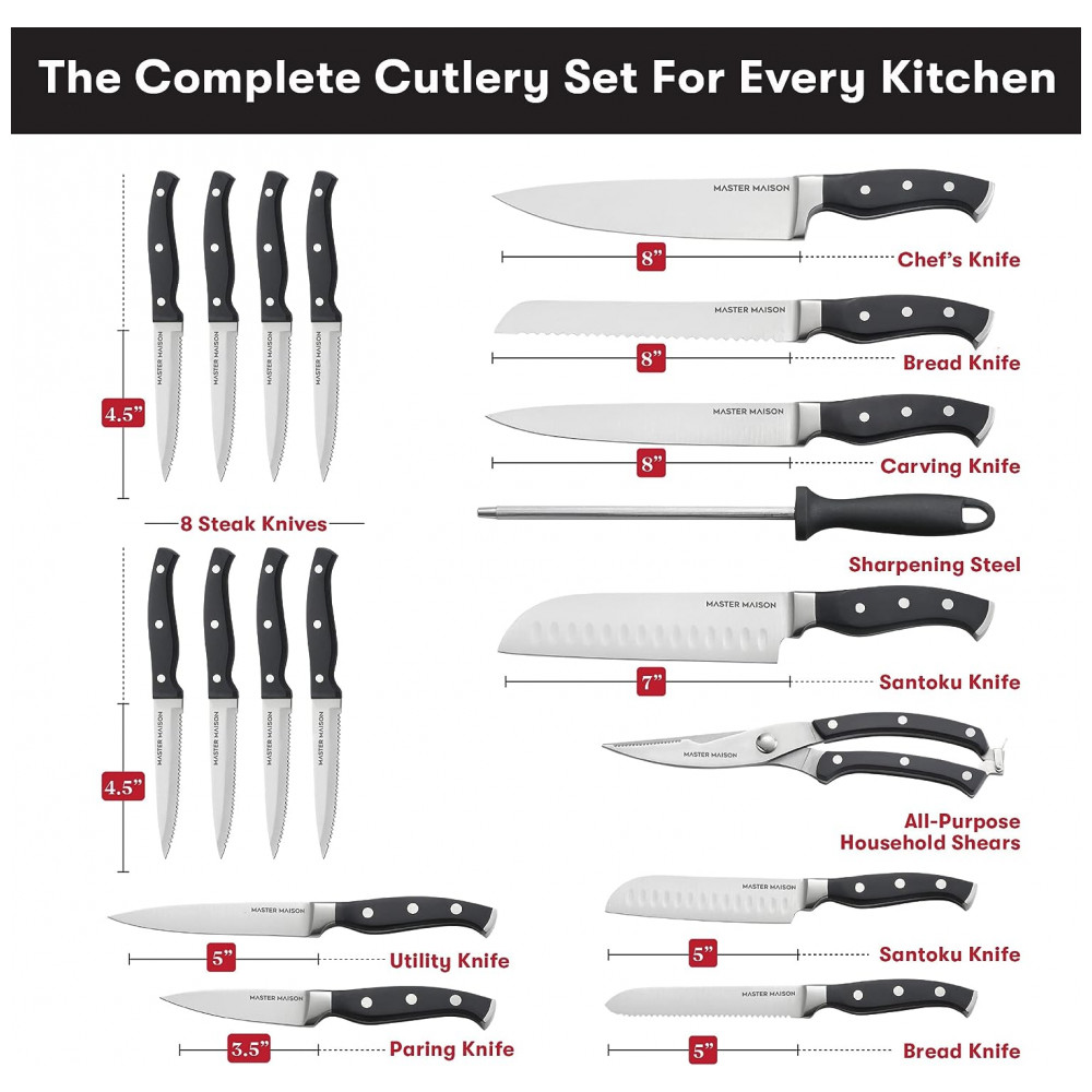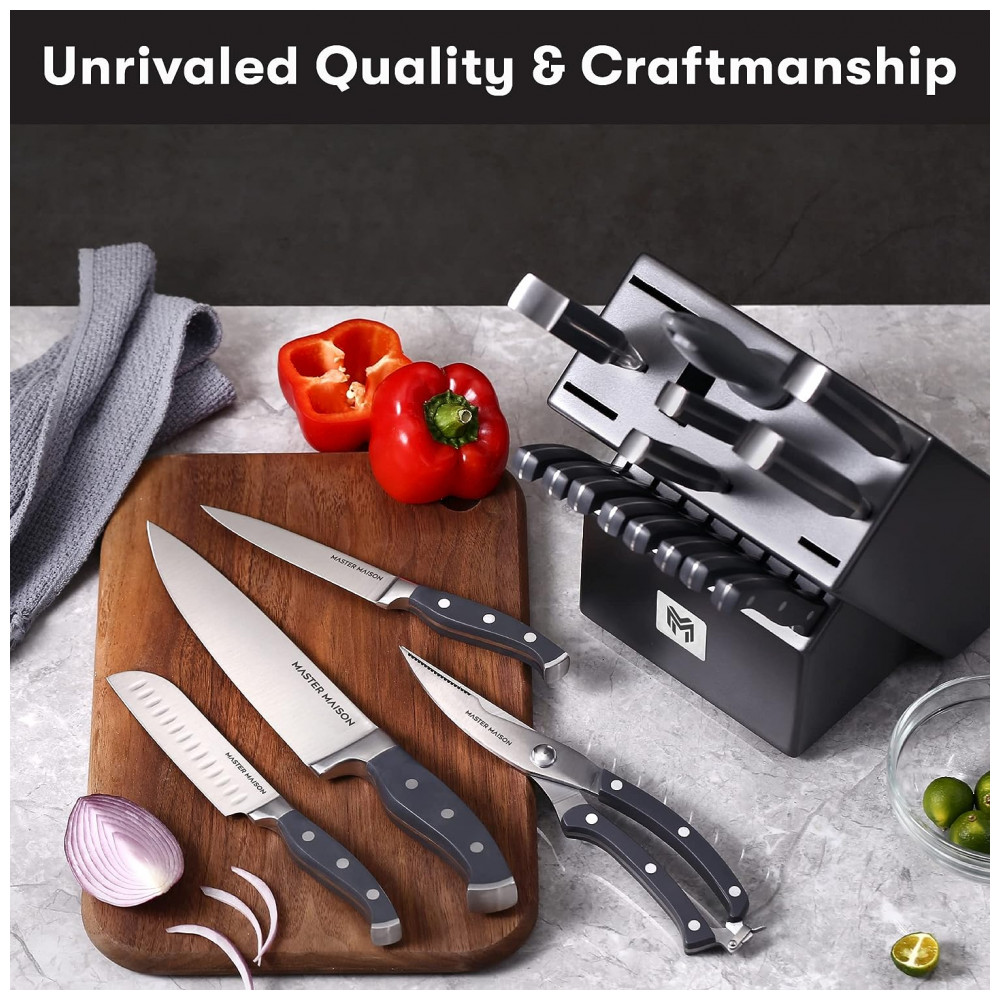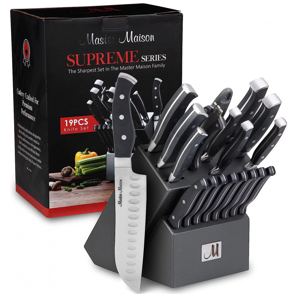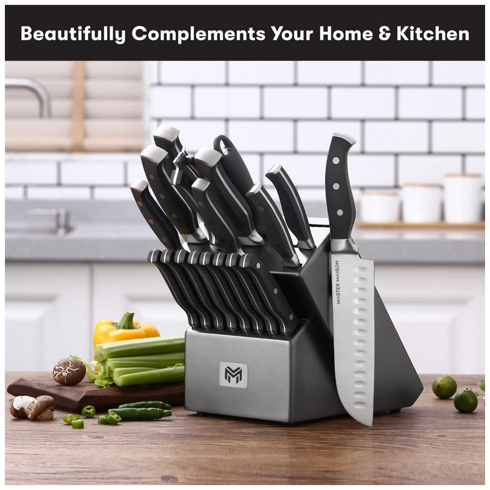 Conjunto de Facas em Aço Inoxidável com Bloco de Bancada, Peças, MASTER MAISON 19 Piece Premium Knife Set w, Block, Preto: QUALIDADE CULINÁRIA A UM PREÇO ACESSÍVEL A Master Maison foi fundada por 2 cozinheiros ao longo da vida que lutaram para encontrar facas de qualidade profissional a preços diários.