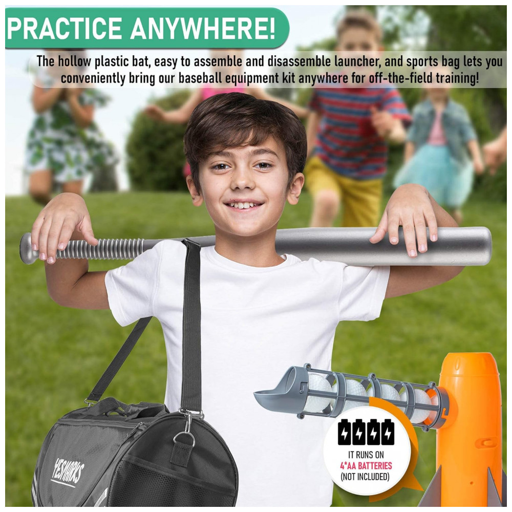 PRATICAR EM QUALQUER LUGAR O taco de plástico oco, o lançador fácil de montar e desmontar e a bolsa esportiva permitem que você leve convenientemente nosso kit de equipamento de beisebol para qualquer lugar para treinamento fora do campo BOLAS DE BACKUP INCLUÍDAS Também jogamos 5 bolas PP extras para um total de 10 bolas PP Com isso, você e seu filho passarão mais tempo rebatendo em vez de pegar bolas.