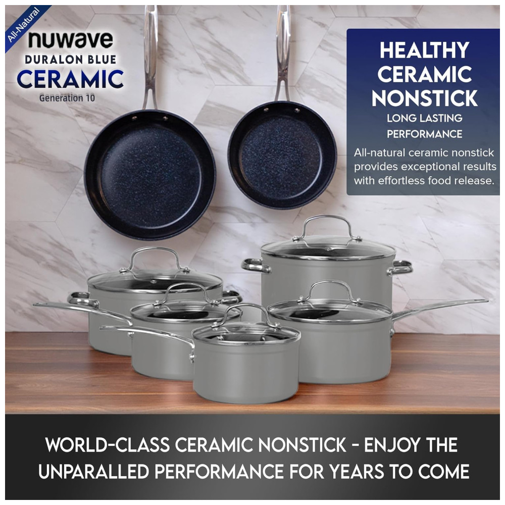Conjunto de Panelas Antiaderente em Cerâmica 12 Peças com Infusão de Diamante, sem PTFE e PFOA, Seguro para Forno, Tampas de Vidro Temperado e Alça que Permanece Fria, NuWave, Cinza e Azul