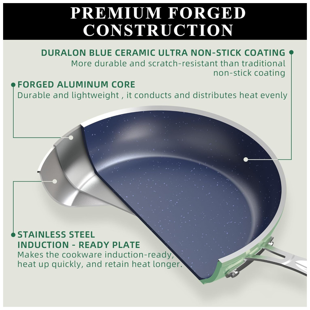 Conjunto de Panelas Antiaderente em Cerâmica 12 Peças com Infusão de Diamante, sem PTFE e PFOA, Seguro para Forno, Tampas de Vidro Temperado e Alça que Permanece Fria, NuWave, Verde: Este conjunto de panelas é construído com forjamento premium, tornando as fortes e duráveis, mas leves e fáceis de manusear.