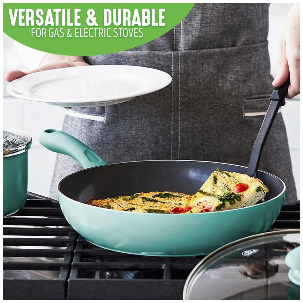 Conjunto de Panelas Antiaderente Revestida de Cerâmica e Utensílios, 13 Peças, GREENLIFE CC002349 001, Azul: Nosso saudável revestimento antiaderente Thermolon Minerals é feito de areia e livre de PFAS, PFOA, chumbo e cádmio As panelas são reforçadas com diamantes para distribuição de calor de alto nível, durabilidade e resistência a arranhões O revestimento antiaderente cerâmico saudável cria 60 menos emissões de CO2 durante sua fase de cura do que o antiaderente tradicional Fabricado em alumínio reciclado