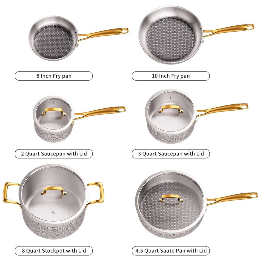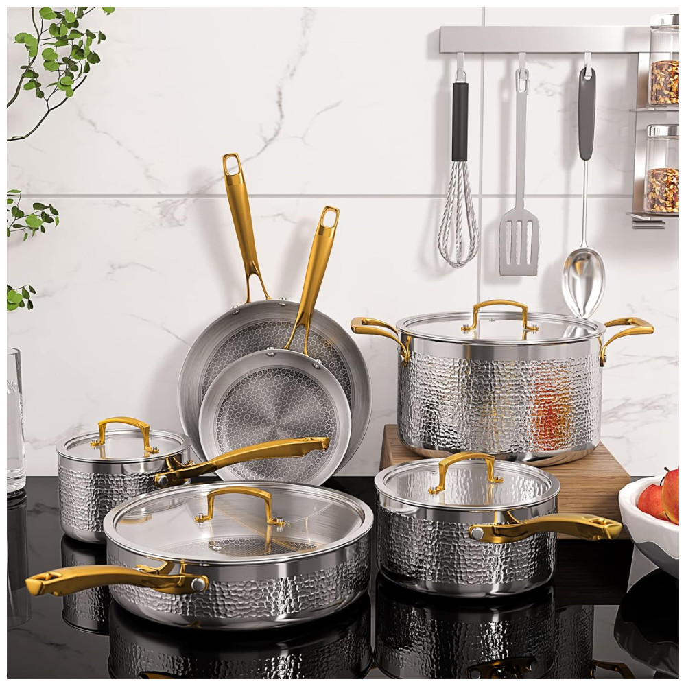 Conjunto de Panelas e Frigideiras 10 Peças em Aço Inoxidável Triplo para Indução e Não Tóxico, Homaz Life, Prata e Dourada