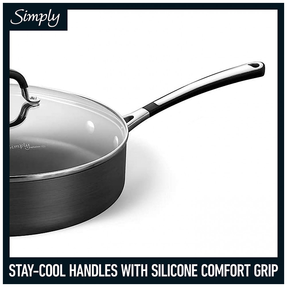 Conjunto de Panelas e Frigideiras Antiaderentes, 10 Peças, CALPHALON SA10H, Preto: As panelas de alumínio anodizado duro são duráveis e resistem à corrosão e à deformação O interior antiaderente durável de 2 camadas evita que os alimentos grudem e facilita a limpeza As alças longas de silicone ficam frescas no fogão