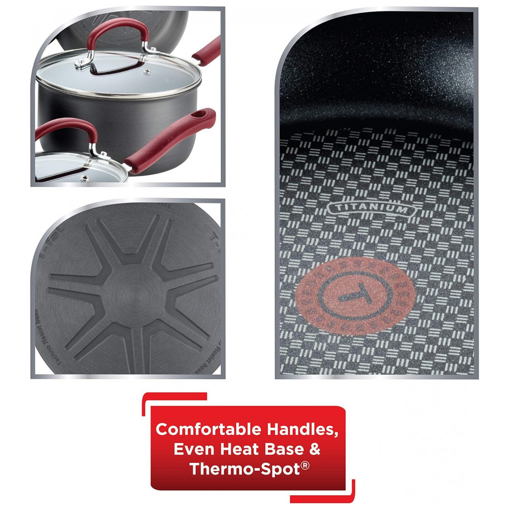 Conjunto de Panelas e Frigideiras Antiaderentes, 12 Peças, T FAL B004SC63, Vermelho: Construído para funcionar Um verdadeiro cavalo de batalha na cozinha, o alumínio anodizado duro retém o calor perfeito e tem uma camada protetora muito mais forte do que o metal , tornando o resistente à corrosão e a arranhões, além de não reagir a alimentos ácidos Sistema de controle de calor O sistema de controle de calor do T fal é uma receita de três ingredientes para resultados de cozimento perfeitamente deliciosos todas as vezes Revestimento antiaderente superior e duradouro, uma base de calor anti deformação e tecnologia patenteada de ponto térmico Indicador de ponto térmico o anel ao redor do ponto fica vermelho sólido para mostrar quando as panelas estão perfeitamente pré aquecidas e prontas para os ingredientes serem adicionados o pré aquecimento adequado é fundamental para selar o sabor e cozinhar os alimentos uniformemente Antiaderente durável O interior antiaderente resistente a arranhões e livre de toxinas, reforçado com titânio rígido, resiste ao uso diário e mantém os alimentos deslizando suavemente ao longo da superfície, facilitando o cozimento e a limpeza