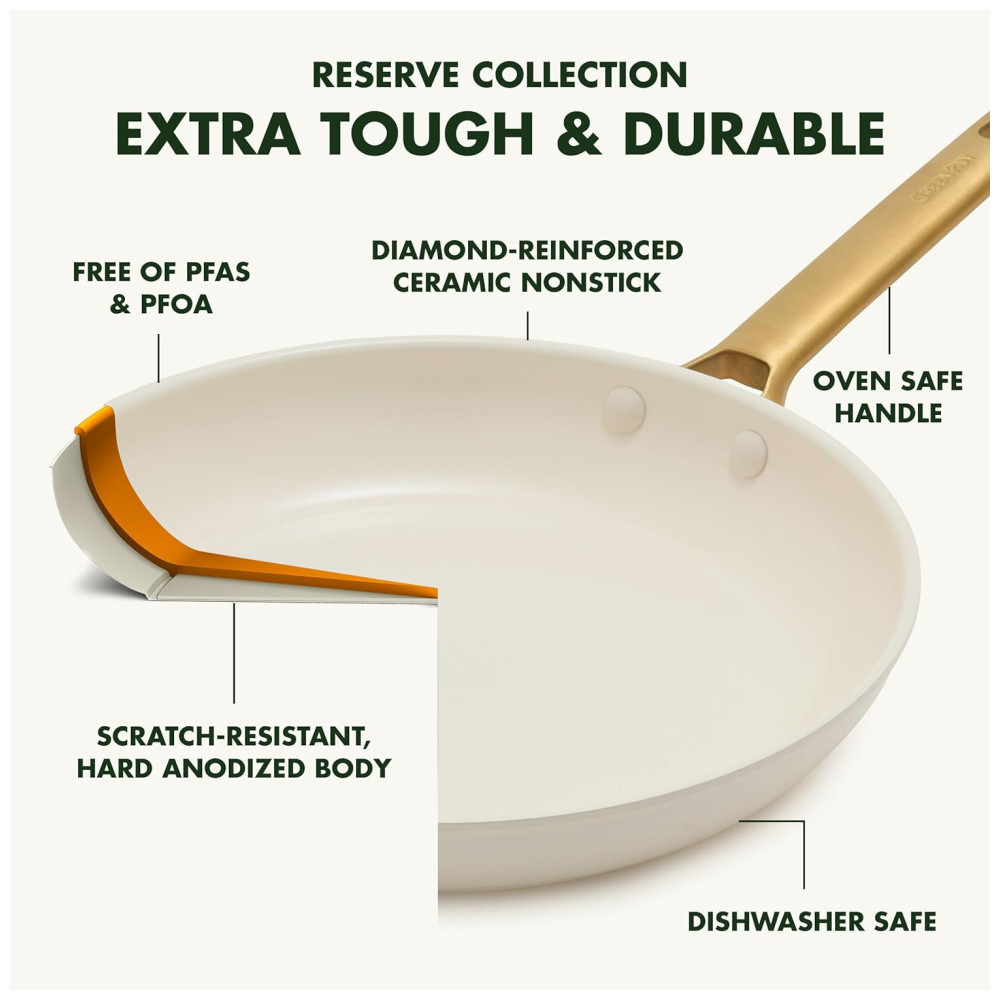 Especificações do produto Material cerâmica, antiaderente sem PFAS, alumínio anodizado rígido, alças de aço inoxidável dourado Cor Branco Creme Tamanho conjunto de panelas e frigideiras de 10 peças Material do cabo aço inoxidável dourado A máquina de lavar louça é segura sim Tipo de material livre livre de cádmio, livre de perfluorooctano sulfonato PFOS, ácido perfluorooctanóico livre de PFOA, livre de PFAS, livre de bisfenol A BPA, livre de chumbo Opções de compatibilidade Pode ser lavado na máquina de lavar louça Número de peças 10 Material de fechamento cerâmica Componentes incluídos O conjunto de panelas inclui panela de 1,87 litros com tampa, caldeirão de 5,60 litros com tampa coadora e 2 bicos, panela de 7,46 litros com tampa, frigideiras de 8 e 11 litros e frigideira refogada de 2,7,46 litros com tampa O forno é seguro sim Dimensões da embalagem 55,24 cm x 34,92 cm x 27,30 cm Peso do item 10,2 quilos Fabricante GreenPan Número do modelo do item CC007721 001