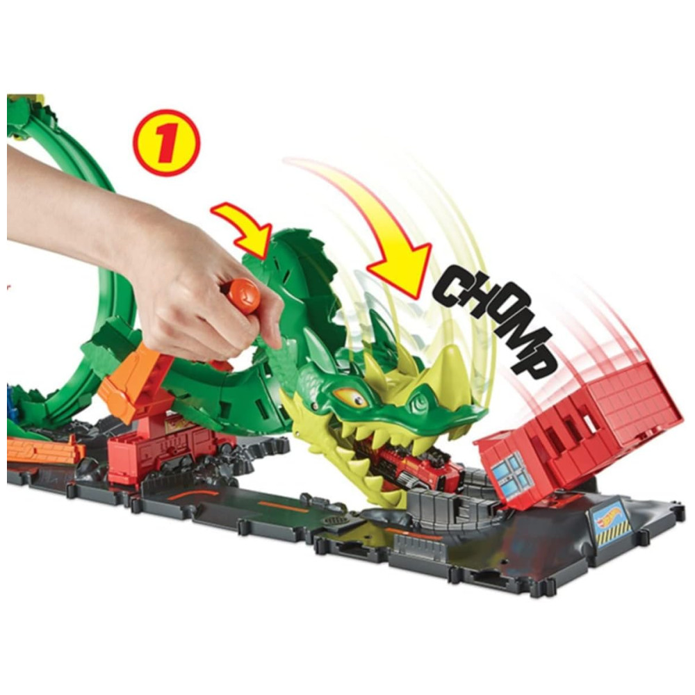 As crianças podem lançar seus veículos Hot Wheels contra a fera para derrubá la e resgatar a cidade.