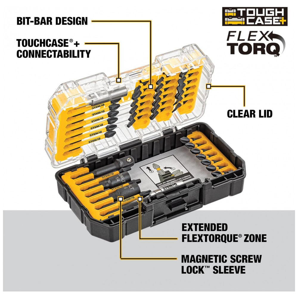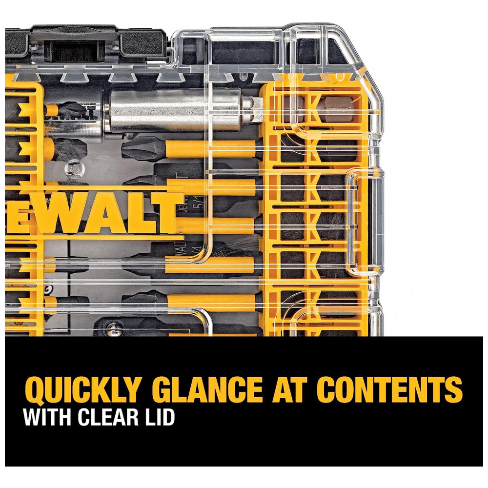 Conjunto de Pontas de Chave de Fenda com Estojo, 40 Peças, DEWALT DWA2T40IR, Amarelo: Sistema de zenamento de acessórios conectável para otimizar o espaço de zenamento do conjunto de brocas O design de barra de bits patenteado do conjunto de bits DEWALT permite fácil remoção de bits e colocação personalizável A tampa transparente do conjunto de bits do driver permite que você veja facilmente o conteúdo de relance Trava de clipe para fechamento O tamanho de zenamento a granel pequeno cabe dentro do Small e Medium ToughCase plus vendido separadamente Ideal para organizar bits soltos Ponta de broca usinada em CNC para ajuste preciso nas cabeças dos parafusos para reduzir a saída do came A zona FlexTorq estendida transfere o torque ideal A luva Magnetic Screw Lock minimiza as quedas e reduz as oscilações