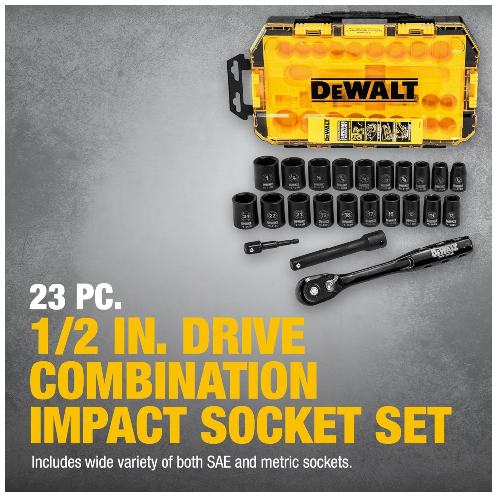Conjunto de Soquetes de Impacto, 23 Peças, DEWALT DWMT74739, Amarelo: A tecnologia DirectTorque do conjunto de soquetes mecânicos ajuda a evitar o arredondamento dos fixadores e proporciona melhor aderência O ring e pino de retenção compatível com o conjunto de soquete de impacto Marcações gravadas a laser nos soquetes de impacto drive para fácil identificação Pronto para impactos com aço CR 440 tratado termicamente