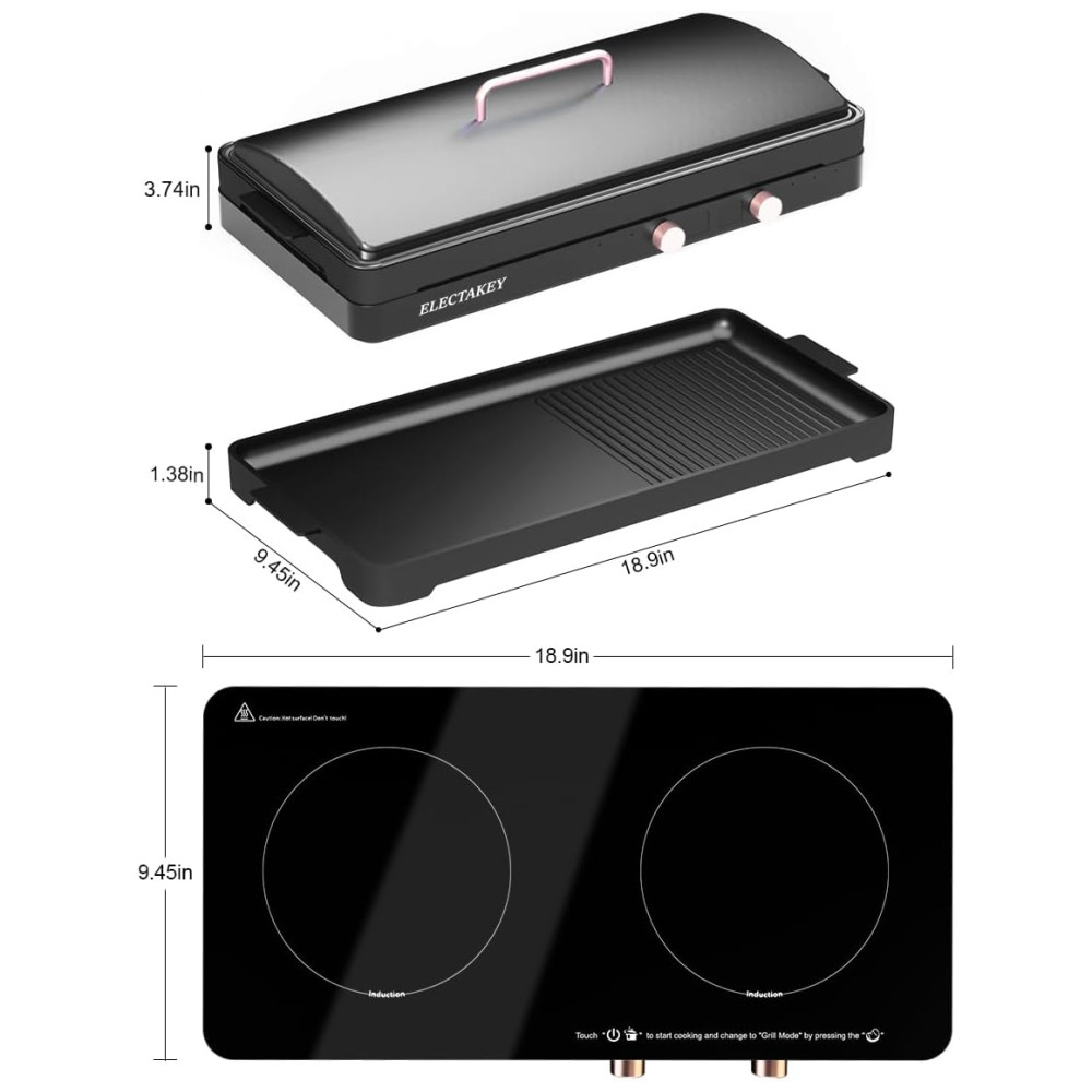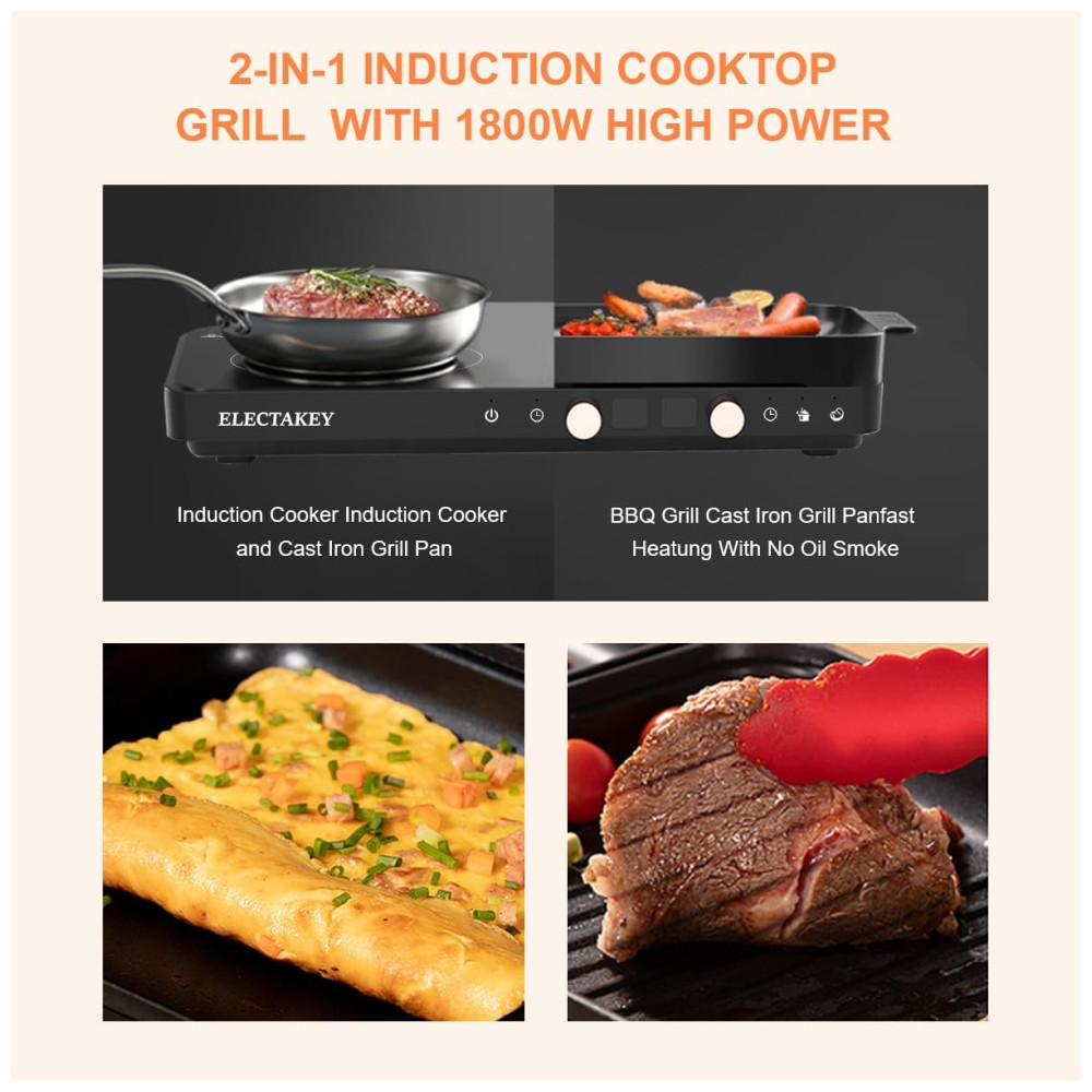 Cooktop de Indução Elétrico com 2 Queimadores, Frigideira Removível Antiaderente e Controle de Temperatura Independente, 110V 1800W, ELECTAKEY, Preto: Conheça o Cooktop de Indução com 2 Queimadores e Chapa de Ferro Fundido Removível Versatilidade e Eficiência para Sua Cozinha 2 em 1 Cooktop de Indução e Chapa de Grelhar O cooktop portátil com 2 queimadores e chapa de ferro fundido removível pode ser utilizado como substituto para grelhas elétricas internas ou como um queimador de indução independente.